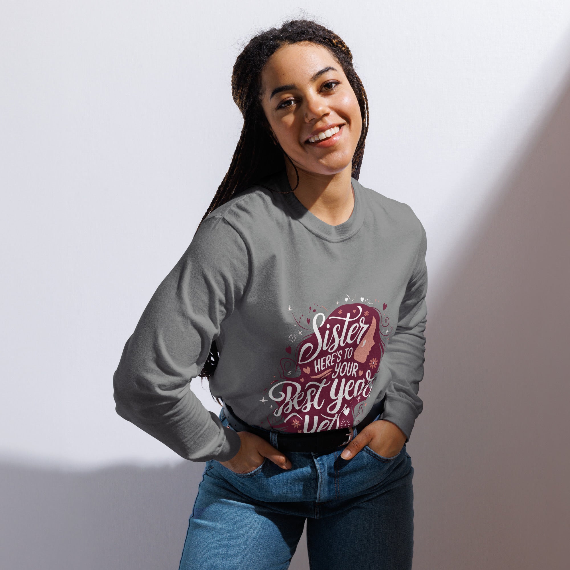 Welcome the New Year by celebrating the bond with your sister through this artistic design. Featuring a vivid blend of deep maroon hues and whimsical swirls, it’s an ode to cherished memories and shared dreams. With its heartfelt message, "Sister, Here's to Your Best Year Yet," this design is perfect for cozy celebrations or gifting a timeless keepsake. True to Giftomory’s ethos of blending "Gift" and "Memory," this shirt transforms emotions into wearable art, making it a standout choice for meaningful moments.