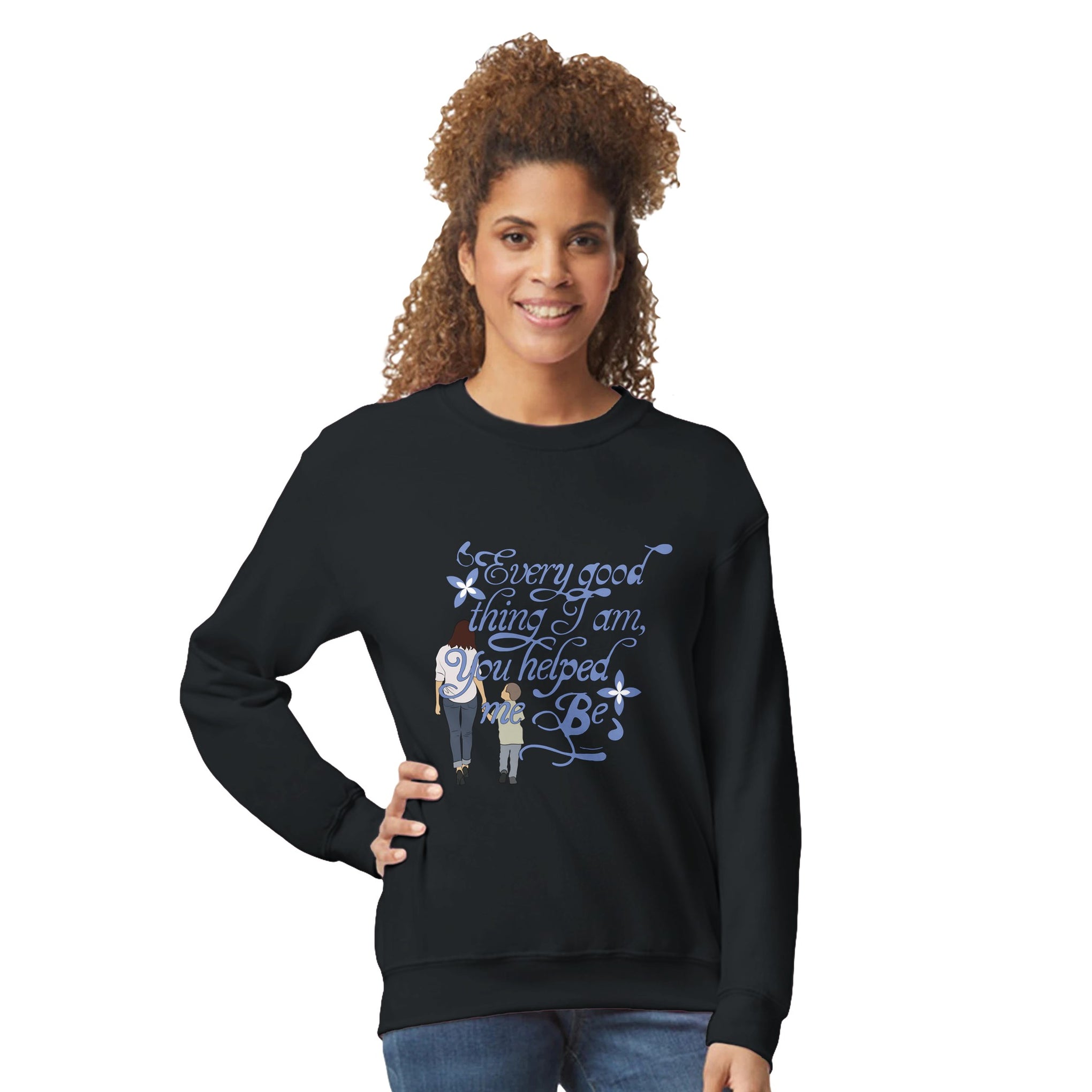 The Classic Unisex Crewneck Sweatshirt showcases a tender design of a mother and child walking hand-in-hand, with the heartfelt quote: “Every good thing I am, you helped me be.” This gift is for the mother figure who shaped your soul. The floral flourishes and soft blue tones gently echo the message of gratitude—an emotional Gift + Memory that warms both heart and home.