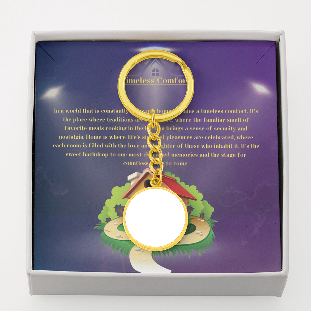 In a world that is constantly changing, home remains a timeless comfort. It's the place where traditions are made, where the familiar smell of favorite meals cooking in the kitchen brings a sense of security and nostalgia. Home is where life's simplest pleasures are celebrated, where each room is filled with the love and laughter of those who inhabit it. It's the sweet backdrop to our most cherished memories and the stage for countless more to come. This quality Circle Photo Keychain is the perfect keepsake, whether for yourself or a loved one. Add the perfect photo of your loved ones, friends, or even pets to create a truly unique photo accessory! If custom engraving is available, engrave your loved one's name, your wedding date, an anniversary, or anything else you want to remember. Each personalized piece offers exceptional craftsmanship, destined to become an instant classic in your family. Make it memorable. Gift it to yourself or someone else.