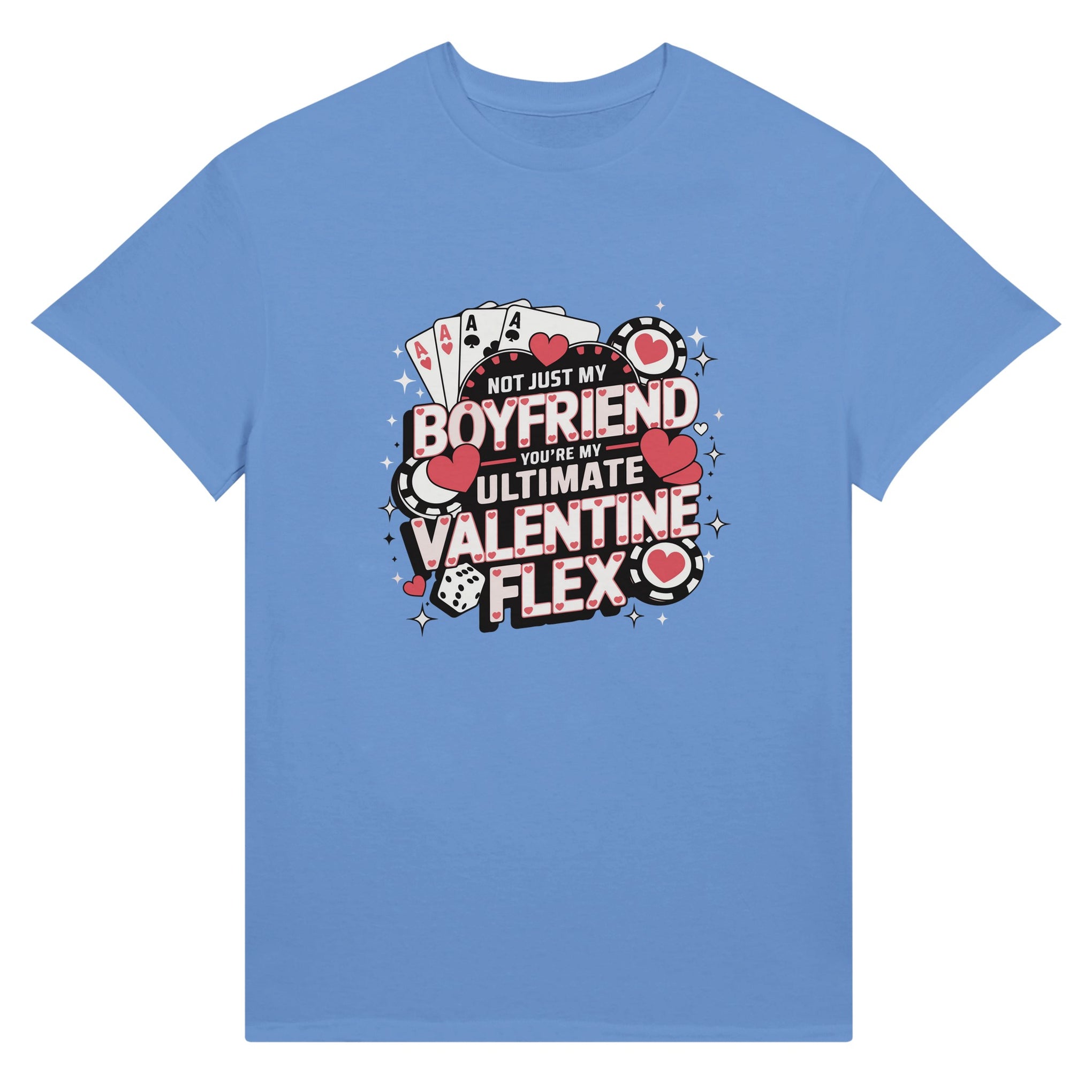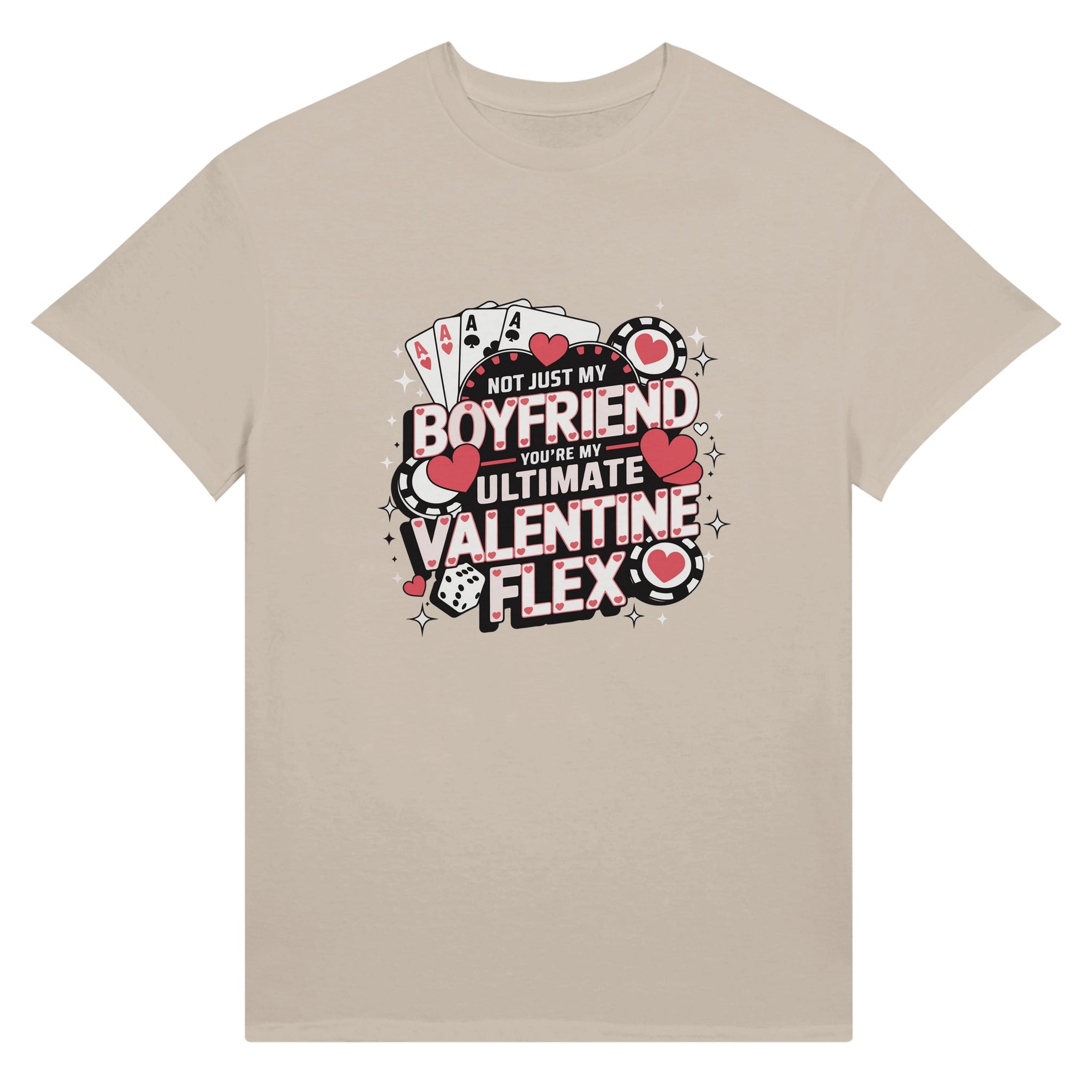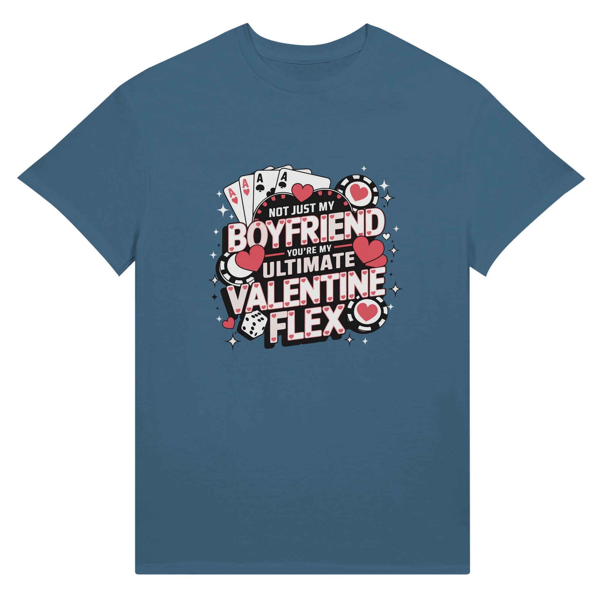 This Valentine’s Day, go all in with love! Celebrate your boyfriend with the “Ultimate Valentine Flex” T-shirt, a design that blends romance with a playful poker-inspired theme. Featuring bold aces, dice, and heart-filled chips, this vibrant graphic symbolizes how lucky you feel to have him. The phrase “Not just my boyfriend, you’re my ultimate Valentine flex” is both heartfelt and confident, making it the perfect gift for your winning hand. Designed in striking pink, red, and black tones, this tee captures both fun and passion. Giftomory’s unique fusion of “Gift” and “Memory” ensures this tee will be cherished for years to come.