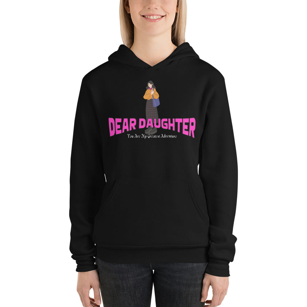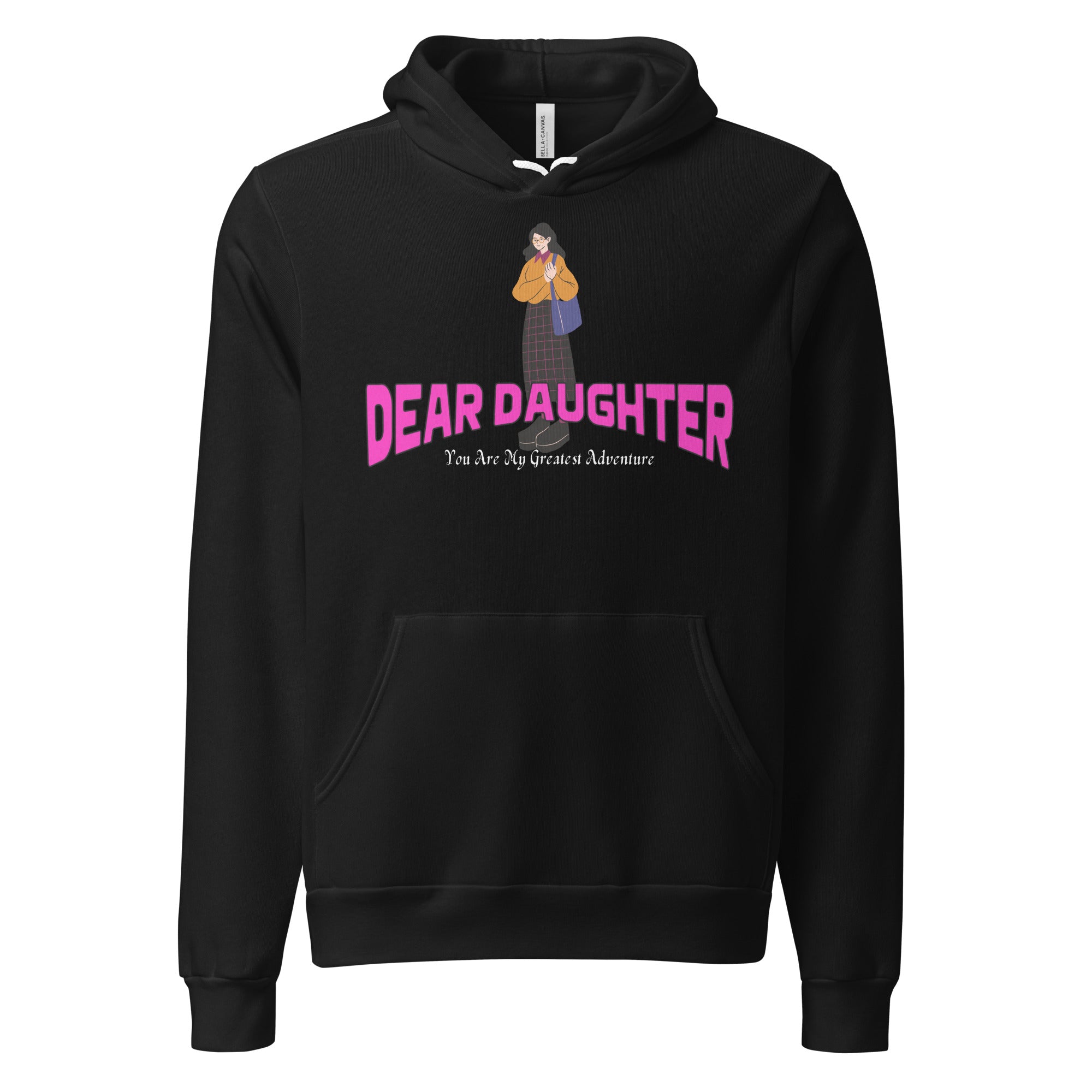 Celebrate the extraordinary journey of parenthood with our "Dear Daughter" unisex hoodie, designed to honor the vibrant spirit of your daughter. The eye-catching illustration features a stylish young woman, perfectly complemented by the bold text, "DEAR DAUGHTER," in bright pink, capturing the admiration and love a parent feels. The heartfelt message, "You Are My Greatest Adventure," is elegantly crafted in a flowing script, adding warmth and depth to the design. This hoodie creates a cozy ambiance that invites reflection and connection, making it an ideal piece for those cherished moments together. At Giftomory, we blend "Gift" and "Memory," ensuring this hoodie becomes a treasured keepsake.