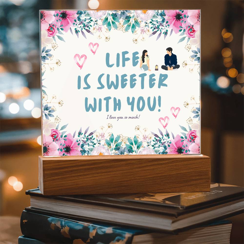 The Acrylic Plaque features a lush watercolor floral border, hand-drawn hearts, and a couple sharing a calm picnic moment around the message “Life Is Sweeter With You.” This gift is for partners who cherish gentle color, soft textures, and cozy light. At Giftomory, every design blends Gift + Memory to elevate bedside tables, shelves, and nooks with a romantic glow.
