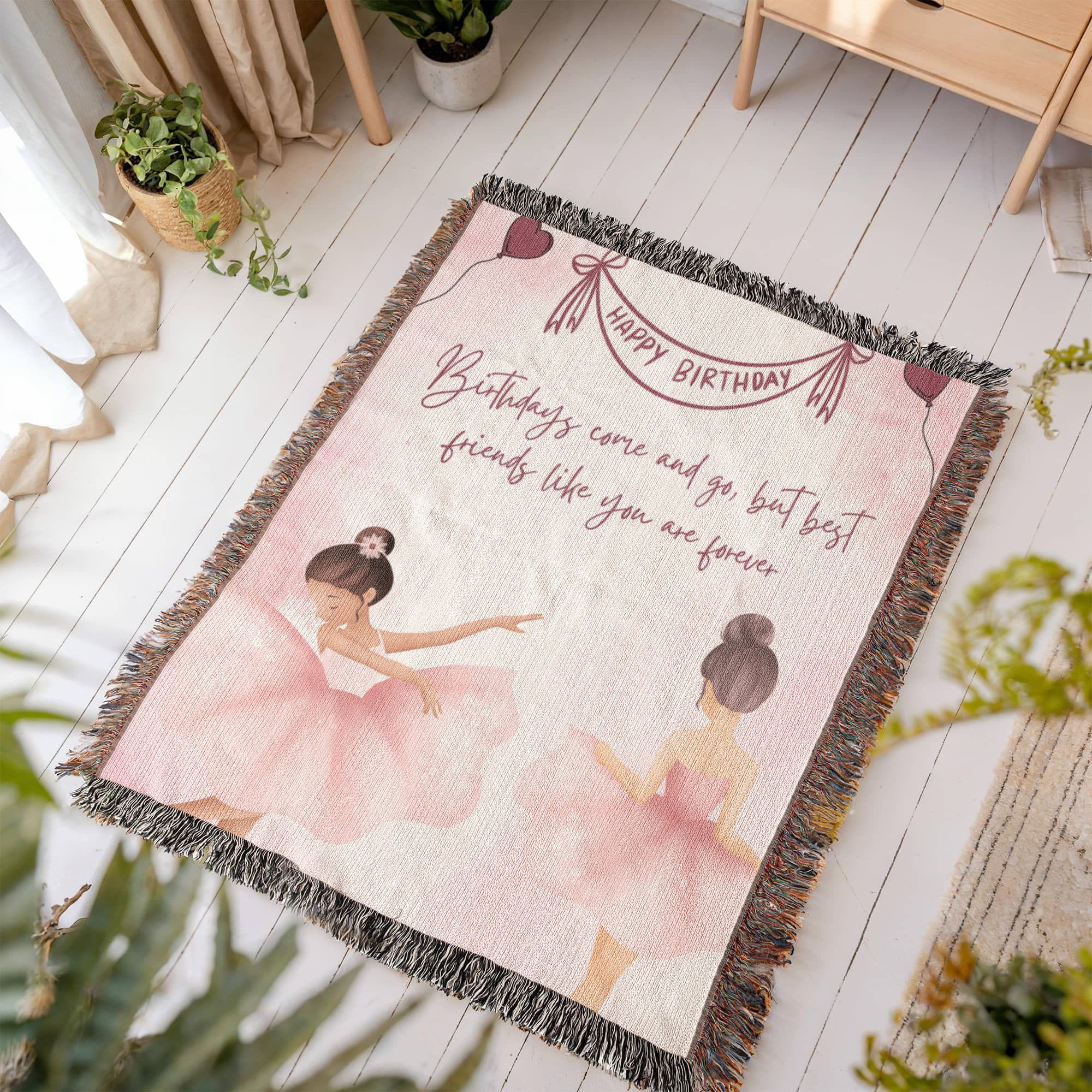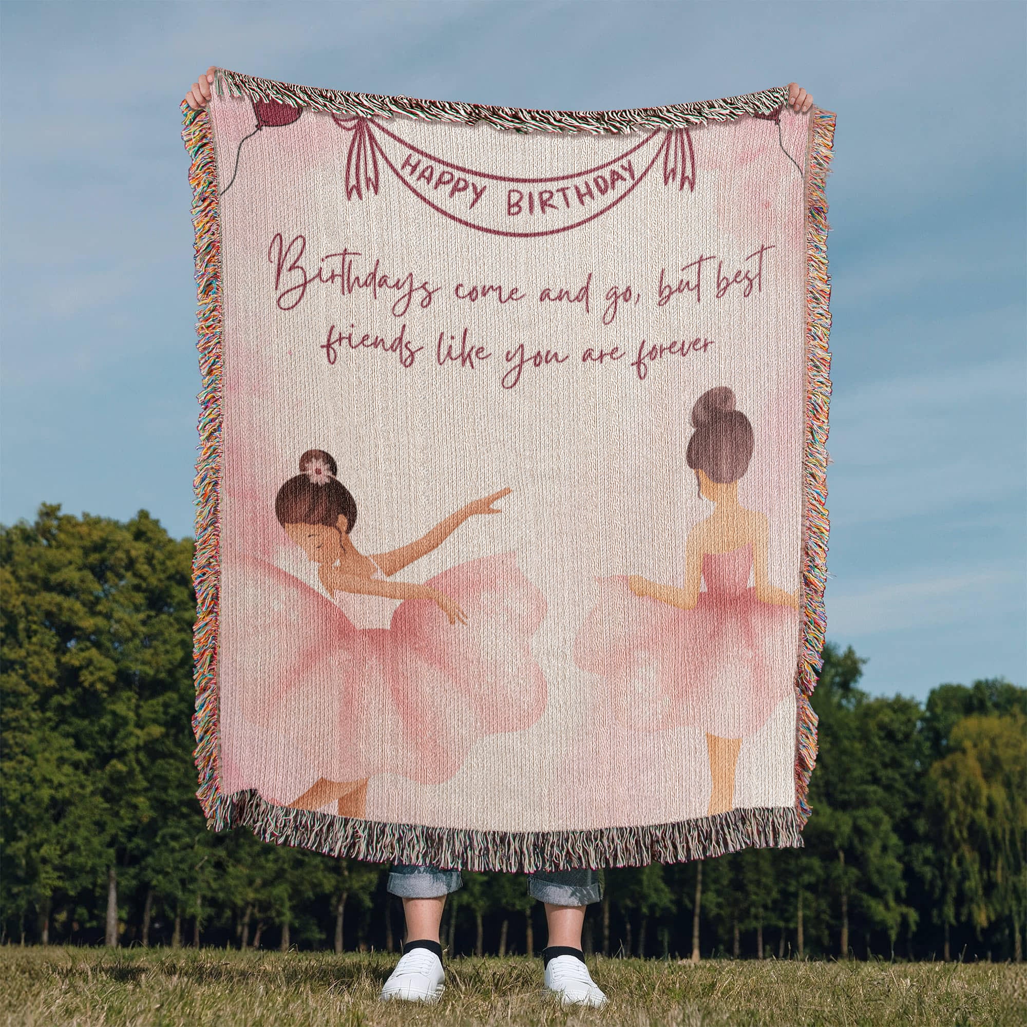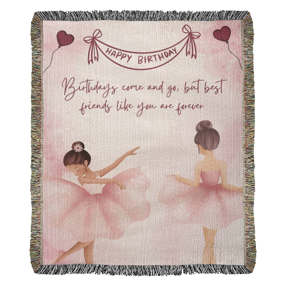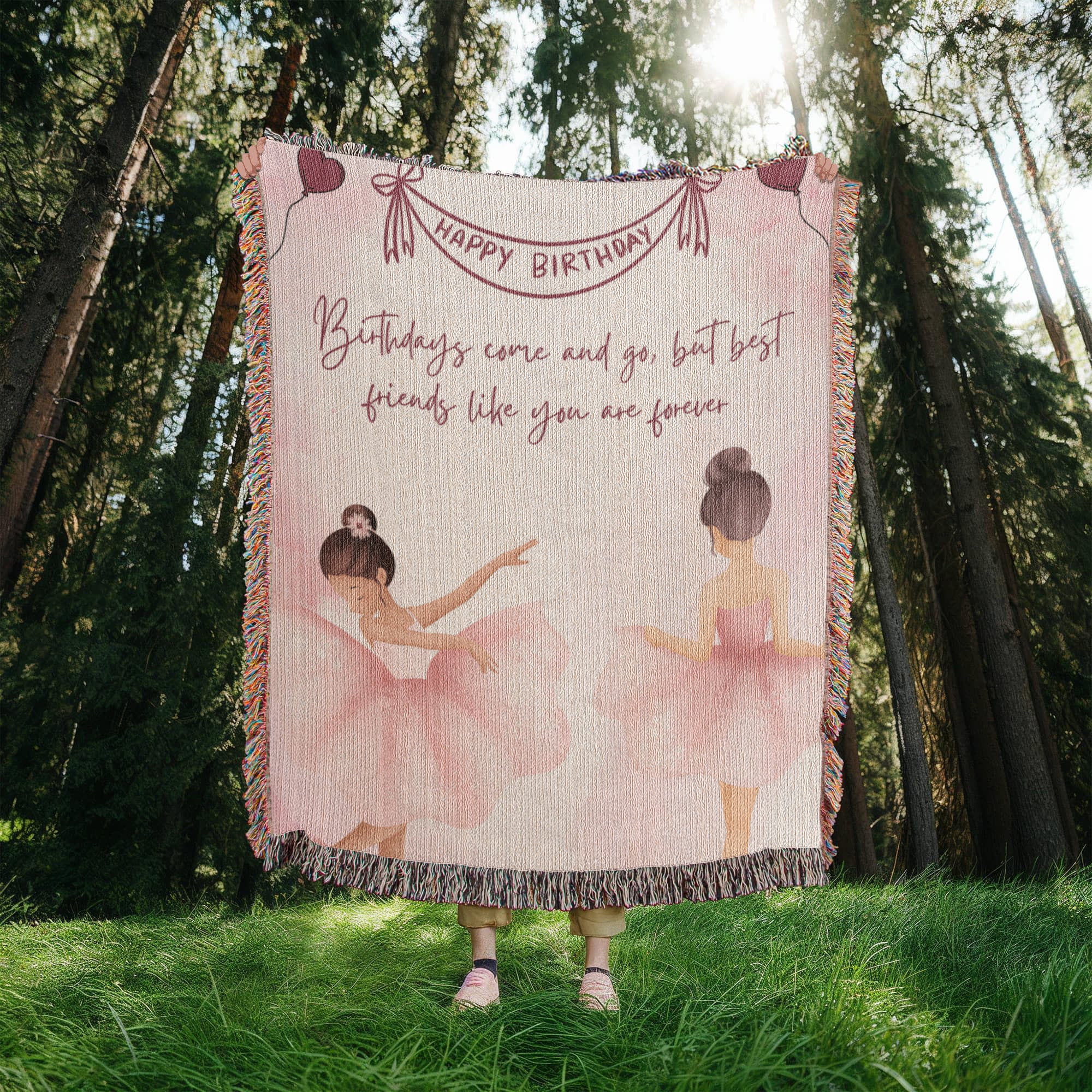 This gift is for your forever friend — the one who adds grace to your life’s every rhythm. The Heirloom Woven Blanket features two ballerinas dancing in harmony on a blush-toned canvas, framed by heart balloons, delicate sparkles, and the message: “Best friends like you are forever.” This soothing pastel artwork adds a soft, emotional ambiance to bedrooms, reading nooks, or calm, creative spaces. It’s our signature expression of Gift + Memory — tender, timeless, and true.