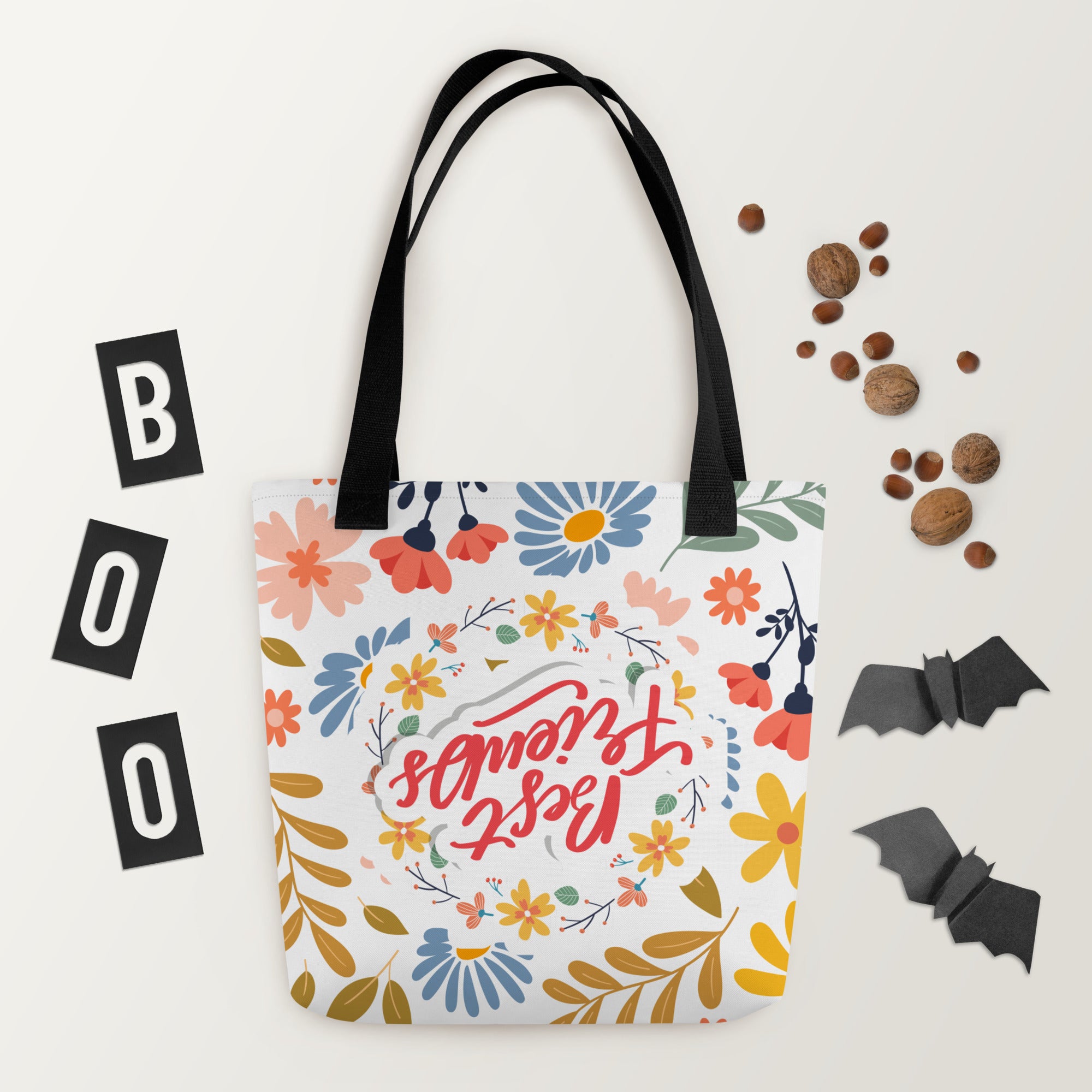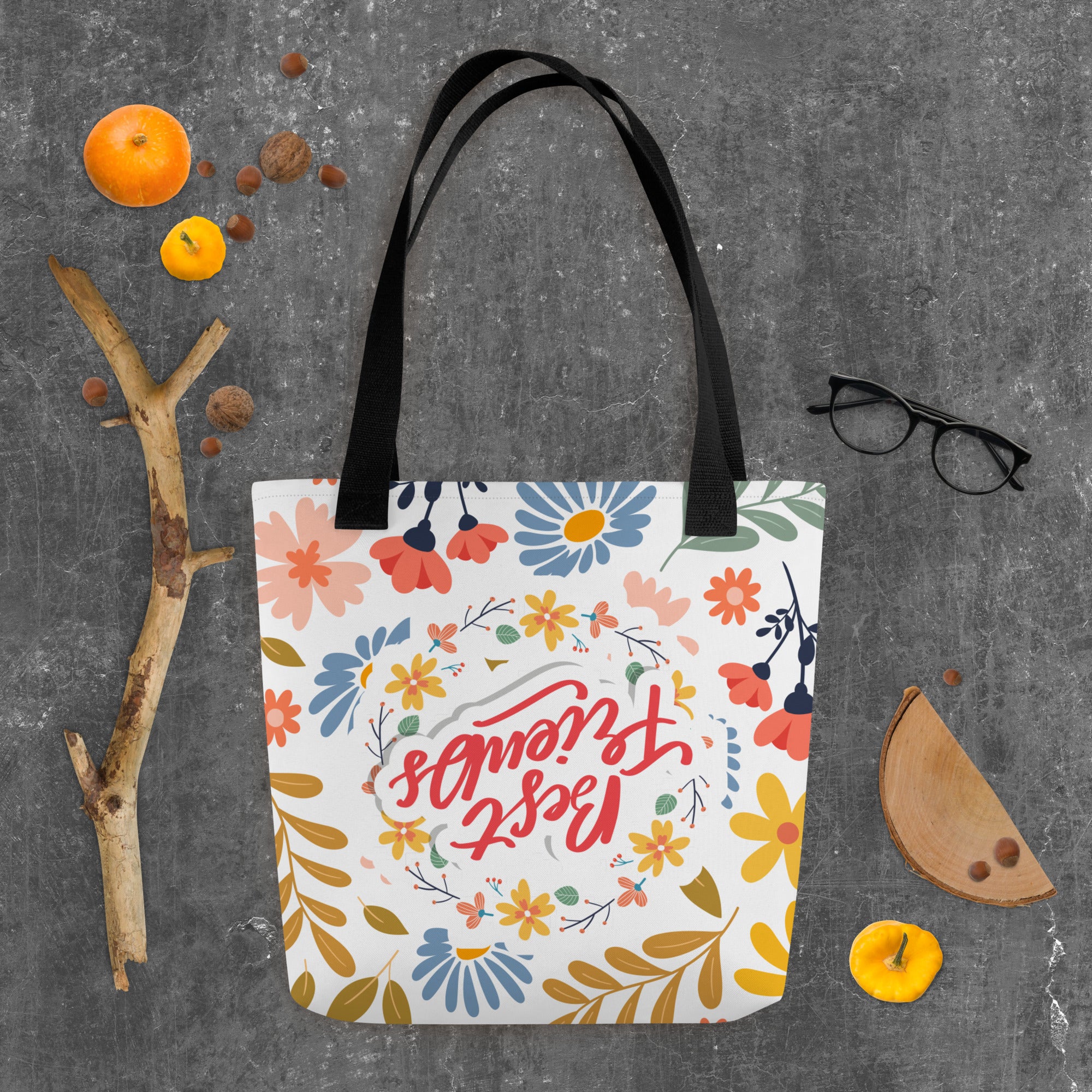 Best Friends Floral Tote Bag - This gift is for the best friend who brings sunshine to your life. The floral design bursts with joy, featuring hand-drawn petals in golden yellow, coral, and blue—surrounding the words “Best Friends” in vibrant script. A tote that holds more than essentials—it carries shared laughter and love. A true Giftomory moment.