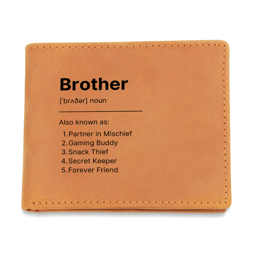 Our Graphic Leather Wallet redefines elegance with its minimalist design—a pure black canvas that speaks volumes through its simplicity, tailored for a brother. The absence of graphics or text transforms this wallet into a personal symbol of brotherhood, inviting your brother to imbue it with his own memories and emotions shared with you. Ideal for a thoughtful, reflective ambiance—like a heartfelt sibling catch-up over coffee—this wallet’s deep black hue exudes sophistication and timelessness, making it a versatile piece for any meaningful moment. Giftomory: Where Gift Meets Memory, this wallet is a perfect gift for the brother who holds a special place in your heart, preserving the memory of your unique bond.