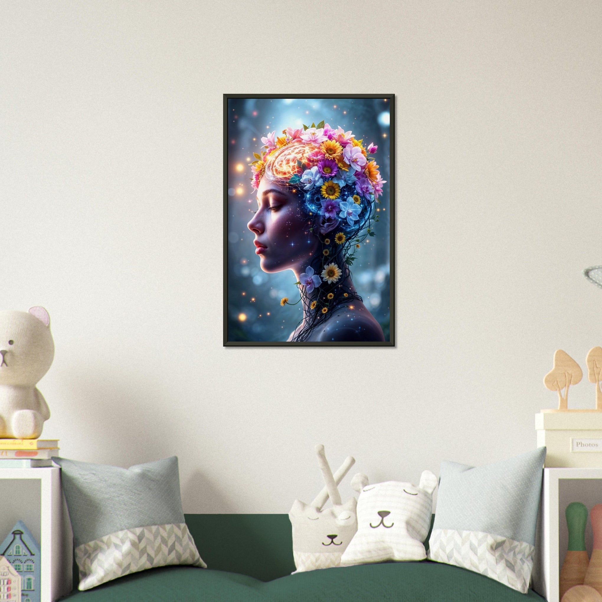 Step into a world of boundless imagination with this radiant wall art that celebrates the harmony of nature, mind, and cosmic wonder. The design captures a serene profile of a woman adorned with vibrant flowers, symbolizing blooming creativity and inner enlightenment, illuminated by starlit sparks. Soft blues and vivid floral hues create a striking contrast, evoking a tranquil yet invigorating ambiance. This masterpiece enhances any space with its dreamlike beauty, perfect for meditative corners, bedrooms, or creative hubs. Make it memorable. Gift it to yourself or someone else.