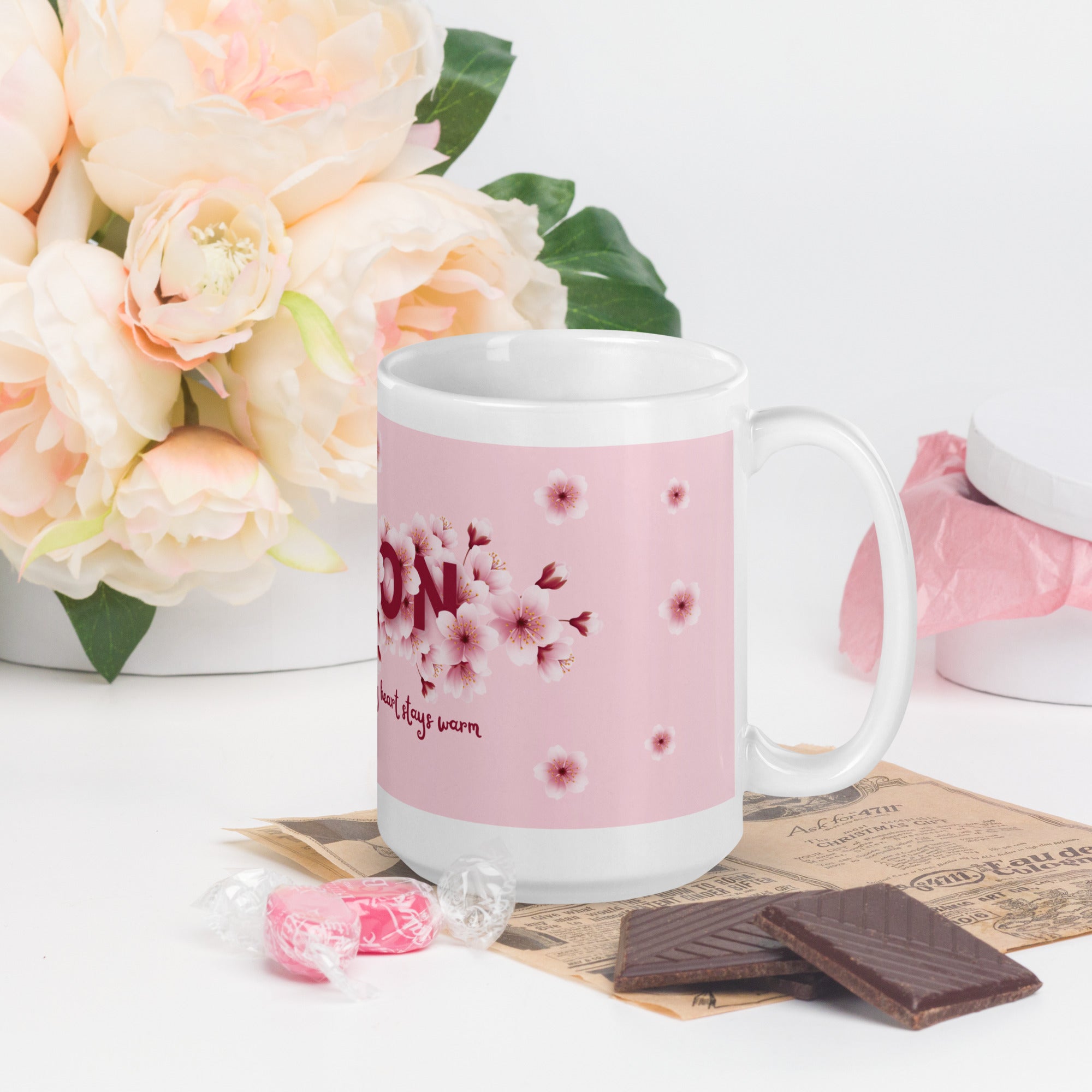 The "My Son" mug is a floral tribute to the warmth and love a son brings into life. Surrounded by a flourish of cherry blossoms in full bloom, this design uses soft pink hues to express heartfelt emotions and the nurturing bond shared between a parent and their son. The elegant script reading, "You're the reason my heart stays warm," enhances the emotional depth of the mug, making every sip a reminder of affectionate connections.