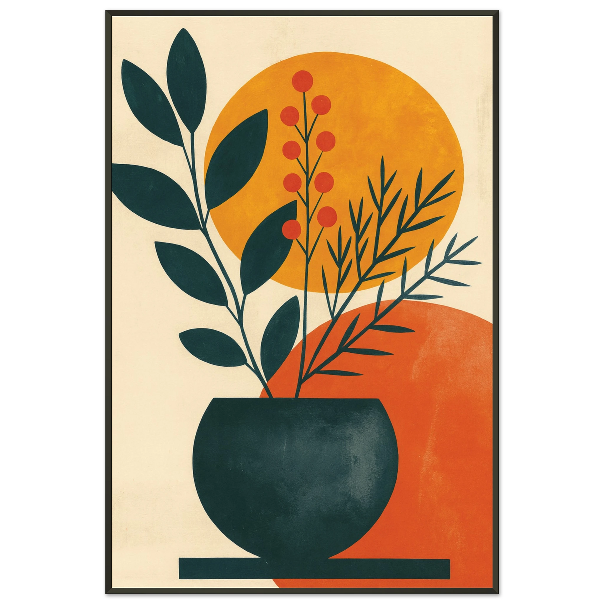 The Botanical Harmony – Metal Framed Poster embodies the balance between nature and design. Deep green leaves rise from a dark pot, framed by radiant orange and yellow circles—echoing sunlight and new beginnings. This gift is for those who find peace in growth and simplicity—where Gift + Memory bloom in timeless modern style.