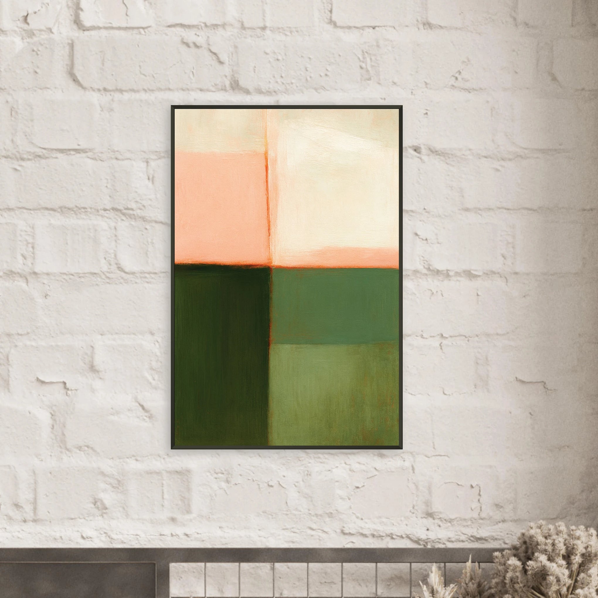 The Metal Framed Poster from Giftomory explores balance through four textured color fields—blush, ivory, and deep, earth-toned greens divided by a warm, hand-drawn line. This gift is for lovers of minimal art, slow living, and serene interiors. Place in living rooms or studies to add quiet harmony—faithful to our Gift + Memory ethos.
