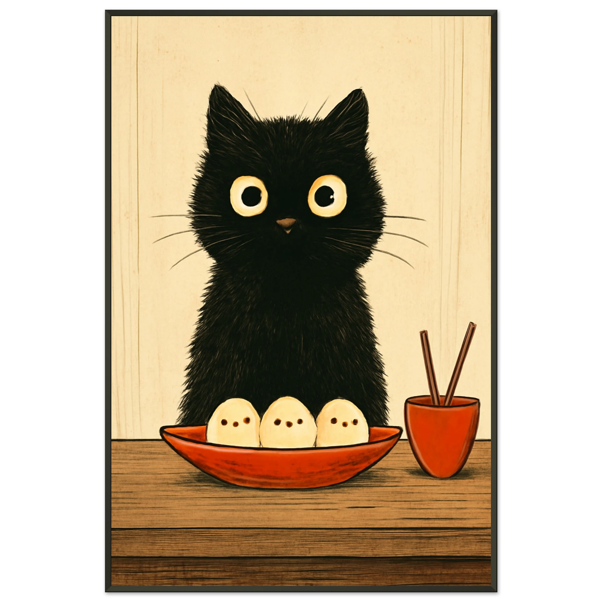 The Black Cat & Dumplings Metal Framed Poster blends playful charm with artistic elegance. The curious, wide-eyed cat and warm-toned setting evoke joy, making it perfect for pet lovers or anyone seeking quirky, heartwarming décor. This gift is for those who love both animals and whimsical art.