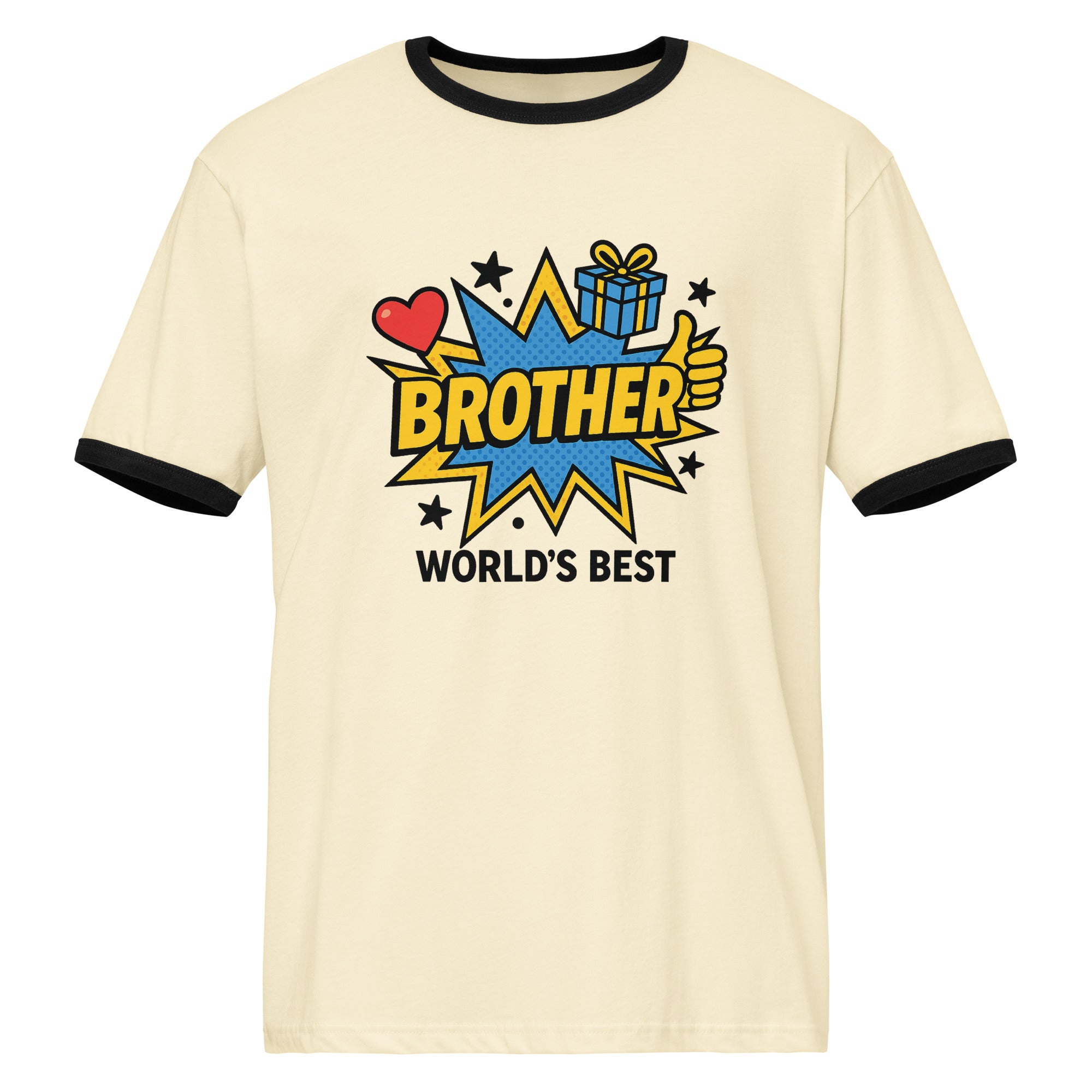 Celebrate sibling love with the World’s Best Brother Unisex Ringer T-shirt from Giftomory. The pop-art explosion, bright blue, red, and yellow tones, paired with playful icons like a heart, gift box, and thumbs-up, capture the joy of brotherhood. This gift is for moments when you want to honor your brother with a stylish keepsake that merges Gift + Memory into one. Perfect for casual wear, gifting, or everyday bonding.