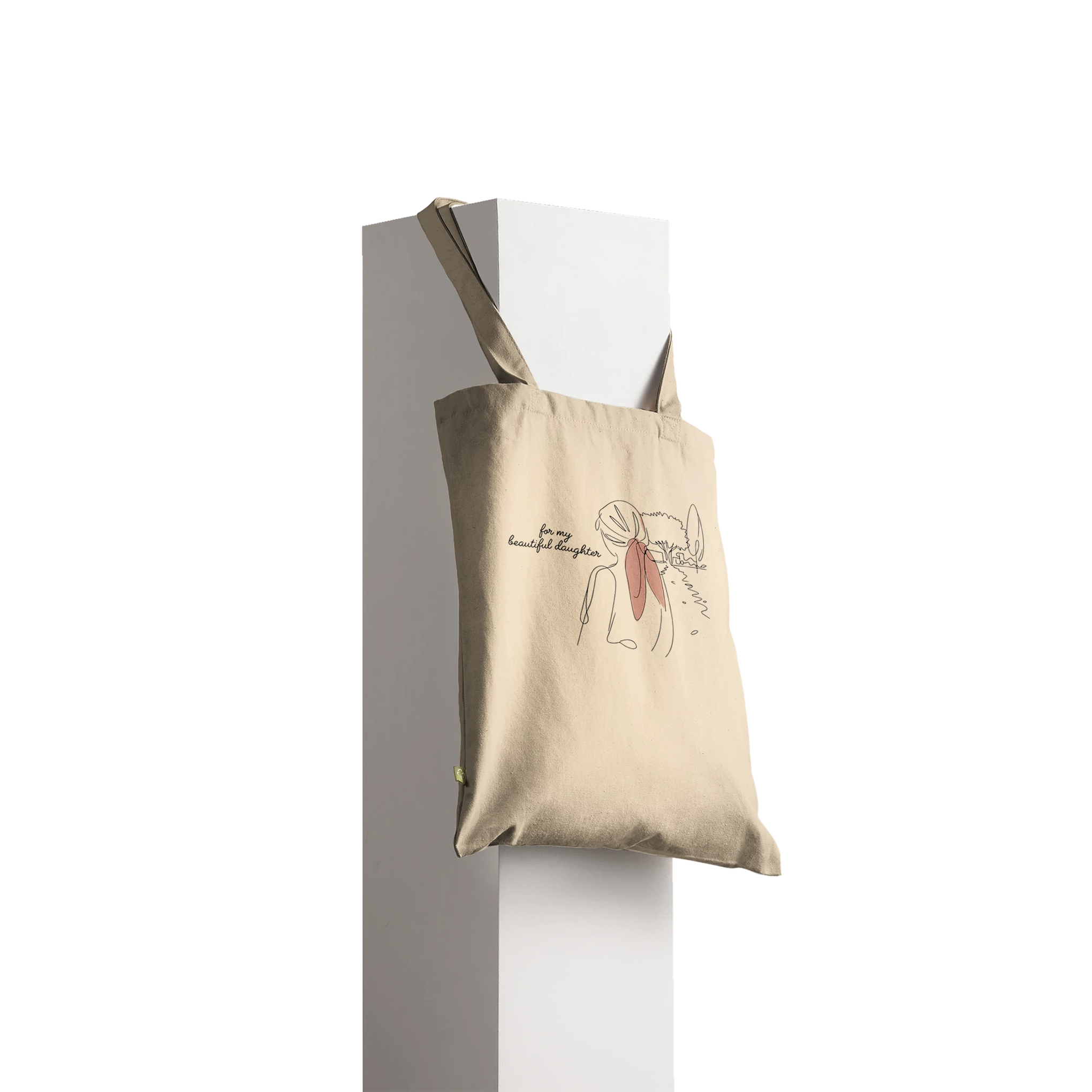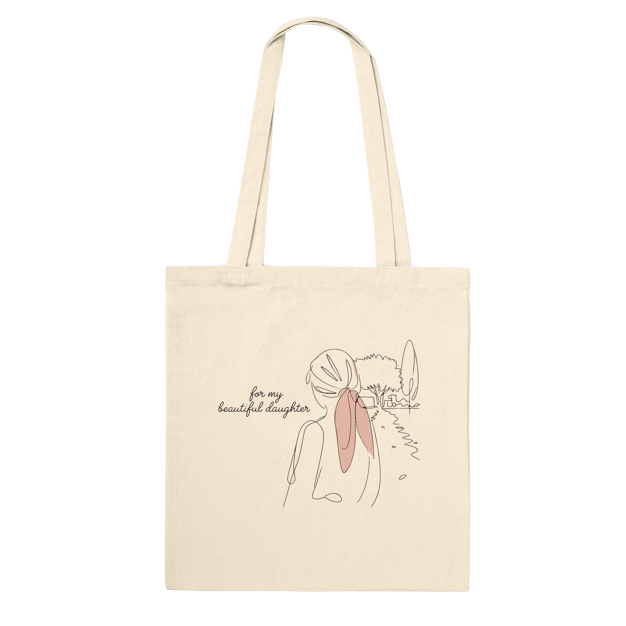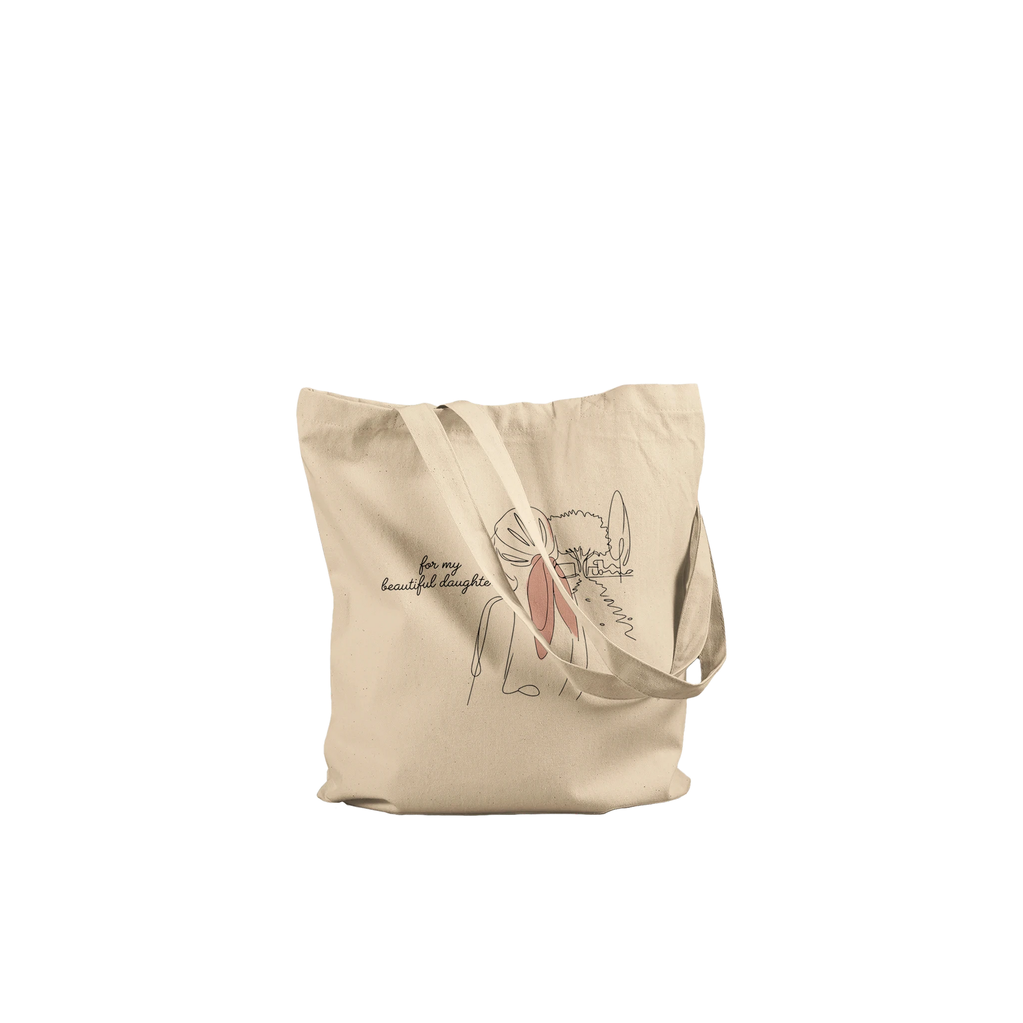 This Premium Tote Bag encapsulates a tender moment of an embrace, symbolizing the unbreakable bond between a parent and daughter. Its minimalist design, dominated by soft peach tones against a stark black background, evokes warmth and love, making it perfect for creating lasting memories. Ideal for everyday elegance or as a special gift, this tote beautifully expresses the sentiment ‘For My Beautiful Daughter,’ enhancing any ambiance with its emotional depth and artistic simplicity.