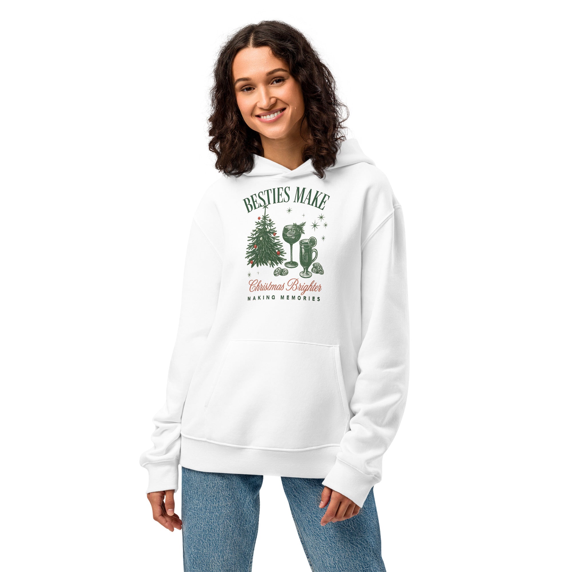 The Besties Make Christmas Brighter oversized hoodie by Giftomory turns holiday cheer into a cozy keepsake. With a festive pine tree, glowing ornaments, and warm drink illustrations, this design celebrates friendship and shared memories. This gift is for best friends who cherish the magic of Christmas moments—perfect for lounging, gifting, or matching this winter.