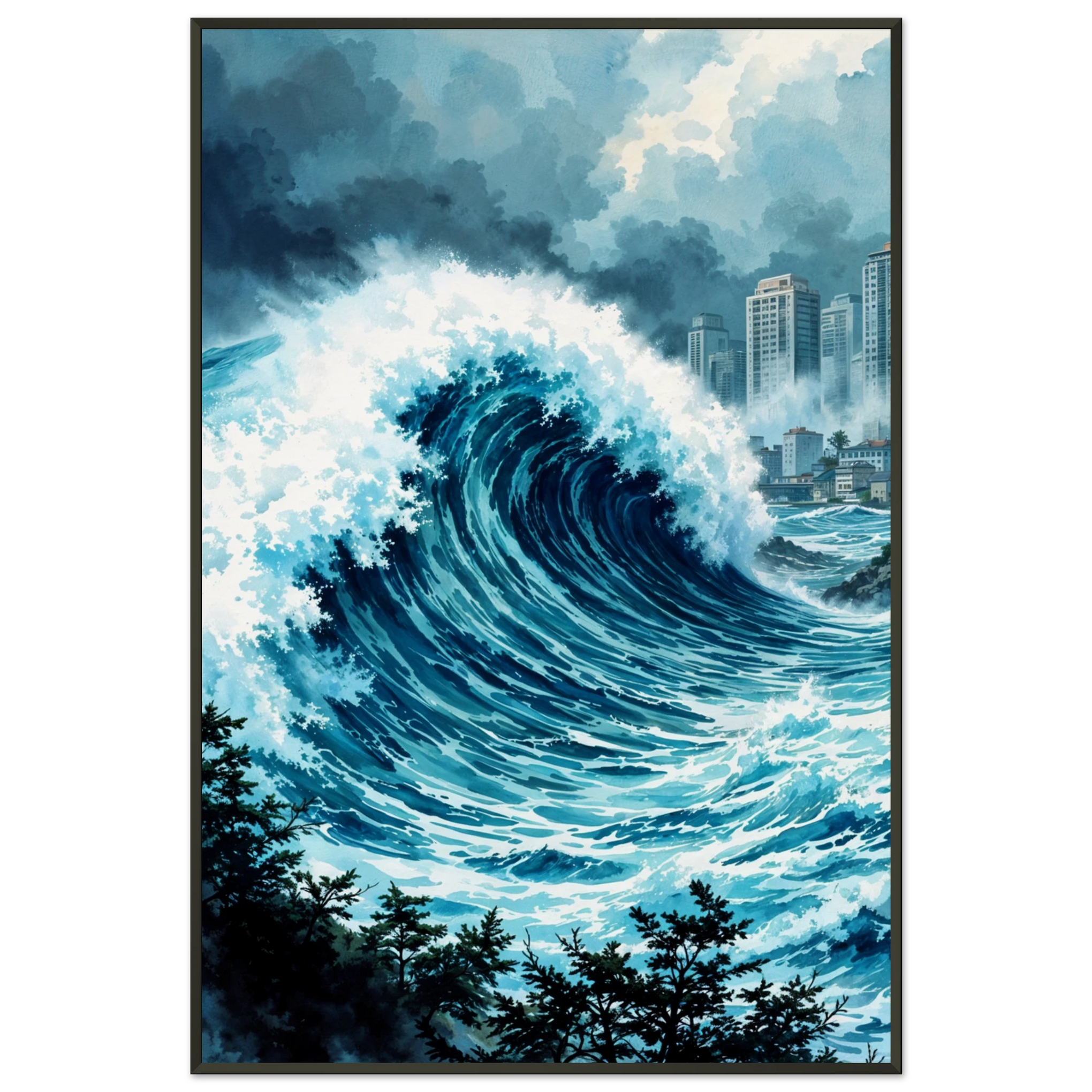 This "Urban Surge" framed poster captures the dramatic interplay between nature's raw power and the urban landscape, embodying the essence of Giftomory by merging "Gift" and "Memory." The swirling blues and whites of the massive wave, the towering cityscape, and the stormy sky evoke feelings of awe, power, and the dynamic tension between nature and civilization. Imagine this piece adorning a living room, office, or creative space, creating an ambiance of dramatic artistry and thought-provoking imagery. The contrasting elements and the powerful composition make it a captivating focal point. The artistic elements, such as the digital illustration style, the dramatic color palette, and the surreal composition, contribute to a memorable and impactful visual experience, making it a perfect gift to cherish and remember moments of artistic appreciation and powerful imagery.