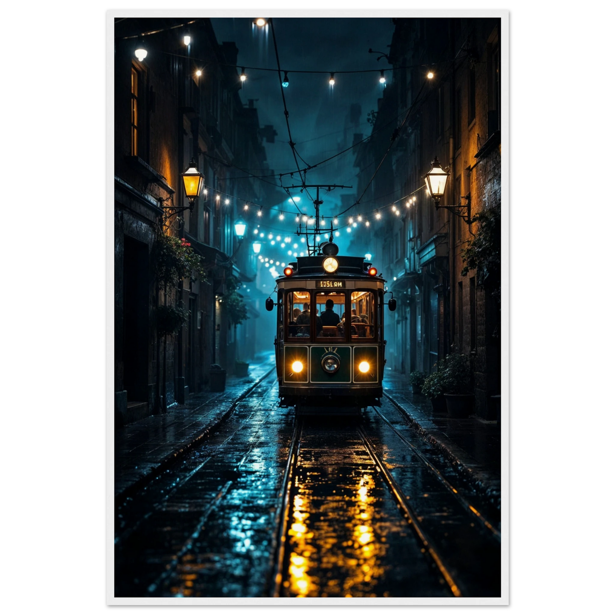 This "Night Tram" framed poster captures the enchanting atmosphere and nostalgic charm of a vintage tram journey through a historic city street, embodying the essence of Giftomory by merging "Gift" and "Memory." The warm glow of the tram's headlights and the reflections on the wet cobblestones evoke feelings of travel, adventure, and the timeless beauty of urban exploration. Imagine this piece adorning a living room, study, or bedroom, creating an ambiance of romantic nostalgia and artistic wonder. The soft, diffused light and the detailed depiction of the tram and street add to the evocative quality, making it a captivating focal point. The artistic elements, such as the warm color palette, the sharp focus on the tram's details, and the atmospheric lighting, contribute to a memorable and impactful visual experience, making it a perfect gift to cherish and remember moments of travel and urban discovery.