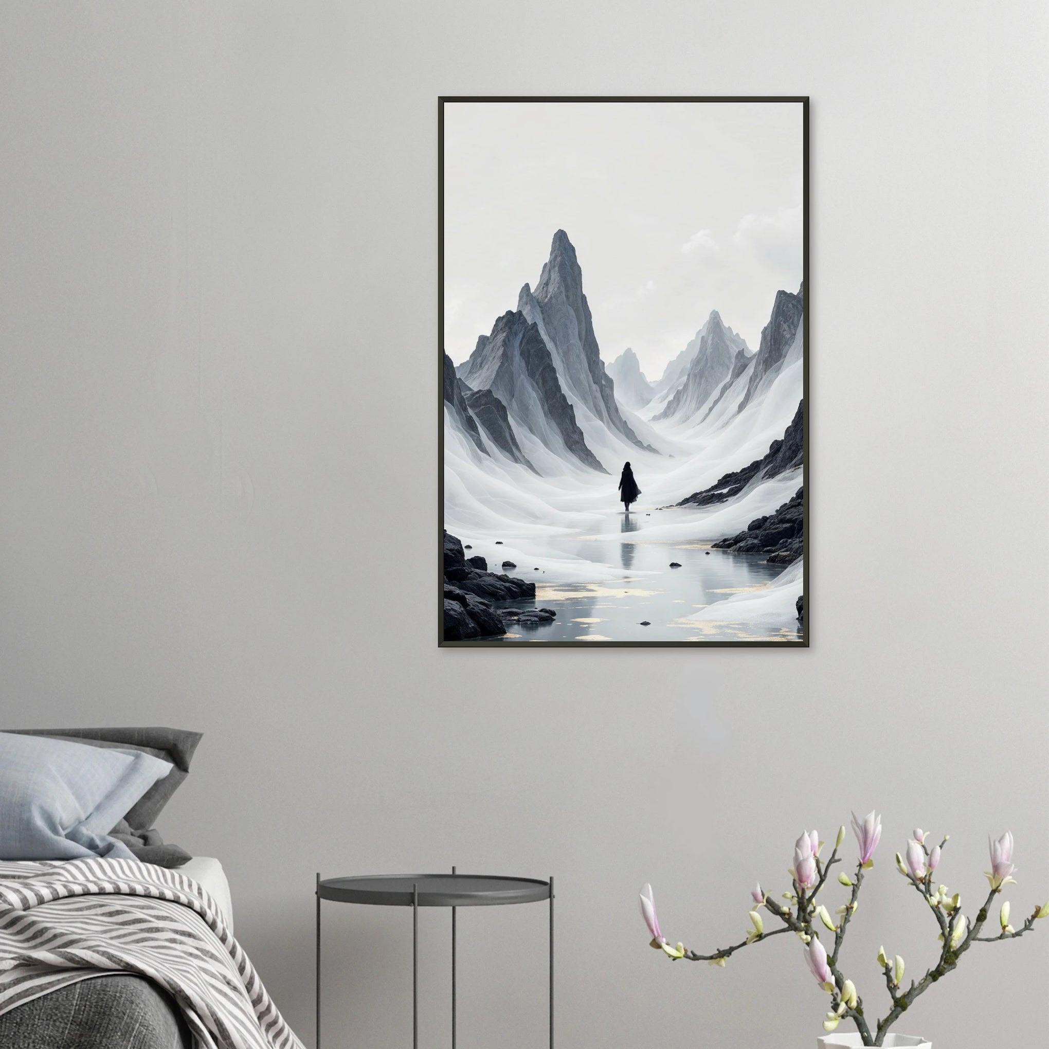 This "Solitary Journey" framed poster captures the profound sense of solitude and the sublime beauty of a vast, snowy landscape, embodying the essence of Giftomory by merging "Gift" and "Memory." The solitary figure, the towering mountains, and the reflective water evoke feelings of introspection, tranquility, and the timeless allure of nature's grandeur. Imagine this piece adorning a living room, study, or meditation space, creating an ambiance of serene contemplation and artistic inspiration. The detailed rendering of the mountains and the solitary figure make it a captivating focal point. The artistic elements, such as the monochrome color palette, the vast composition, and the sense of solitude, contribute to a memorable and impactful visual experience, making it a perfect gift to cherish and remember moments of introspection and artistic appreciation.