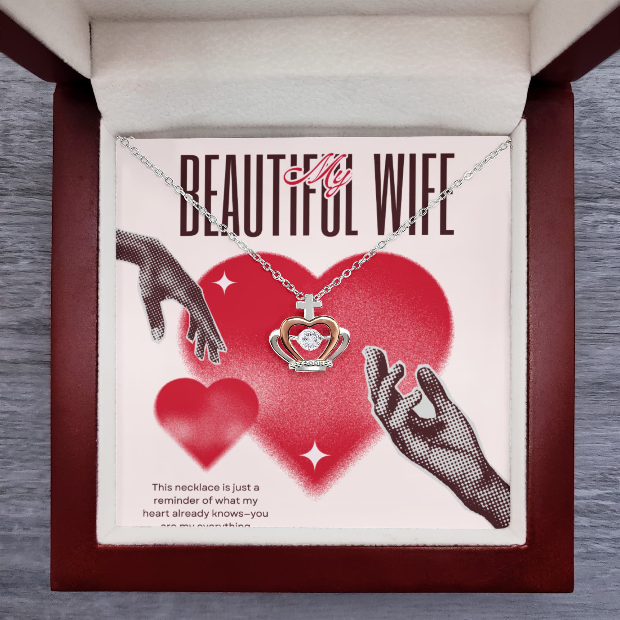 The Crown Pendant Necklace is presented with a striking card design—oversized red hearts paired with halftone-style reaching hands, echoing connection and devotion. The minimal yet powerful imagery conveys intimacy and timeless love, making it ideal for anniversaries, birthdays, or romantic milestones. True to Giftomory’s (Gift + Memory) promise, it transforms emotion into a lasting keepsake. This gift is for the wife who means everything to you.