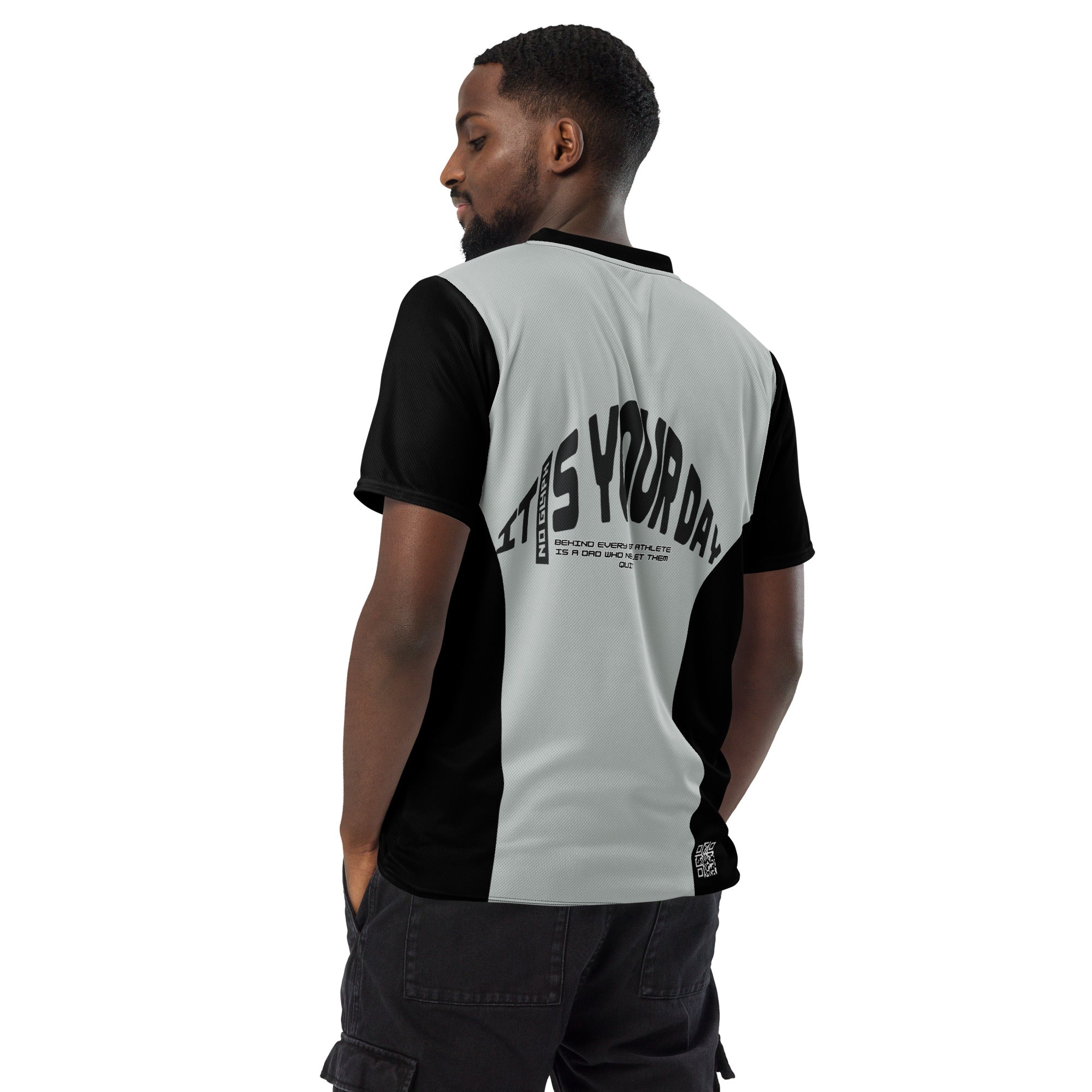 The “It’s Your Day” Dad Tribute Recycled Sports Jersey is an artistic salute to the unshakable strength of fatherhood. This gift is for dads who stand behind every victory, cheering through setbacks and pushing past limits. The sleek black-and-light-gray contrast is both bold and modern, while the back displays an empowering arc that reads “It’s Your Day,” paired with the message, “Behind every great athlete is a dad who never let them quit.” The front design features the word “DAD” placed within an eye shape—symbolizing vision, protection, and presence. A part of our Gift + Memory line, this jersey turns gratitude into style.