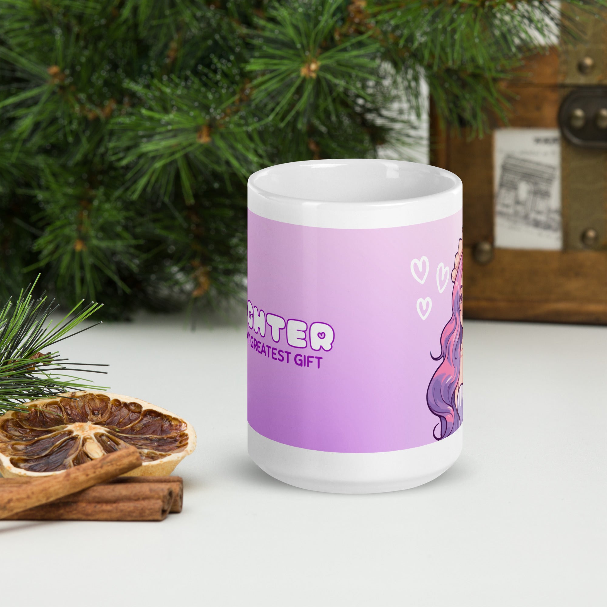 This exquisite "Daughter – You Are My Greatest Gift" mug is more than just a drinkware item—it's a heartfelt tribute to the beautiful connection between a parent and daughter. The soft lavender and pink hues evoke warmth and affection, while the whimsical illustration adds a dreamy, fairy-tale-like touch. Whether it’s for her birthday, graduation, or just a simple reminder of your love, this mug from Giftomory is the perfect way to create lasting memories.