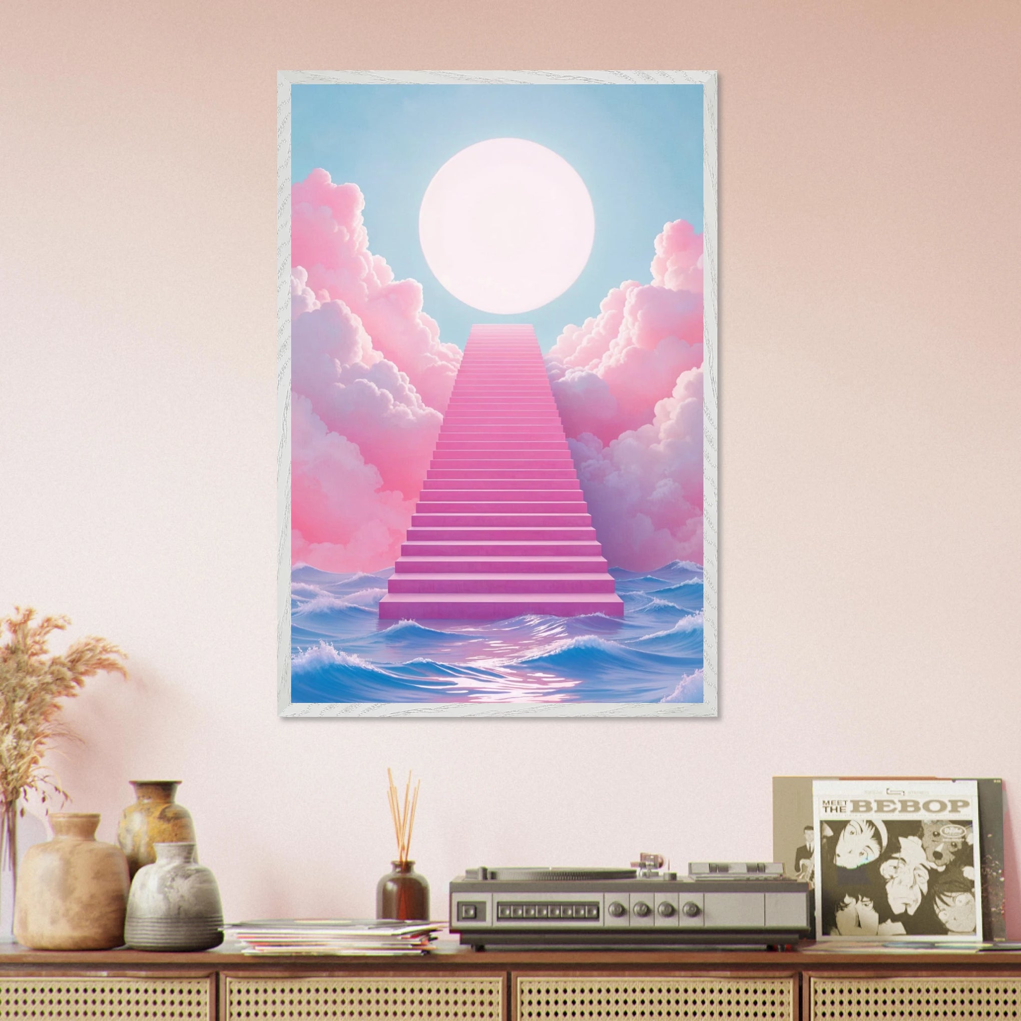 This design features a surreal pink staircase rising through soft ocean waves and pastel clouds, leading toward a glowing celestial orb. A visual metaphor for dreams, transcendence, and inner peace, it invites the viewer into stillness and wonder. This design is for the person who seeks beauty beyond reality, embodying the Giftomory spirit of turning art into an emotion-filled memory