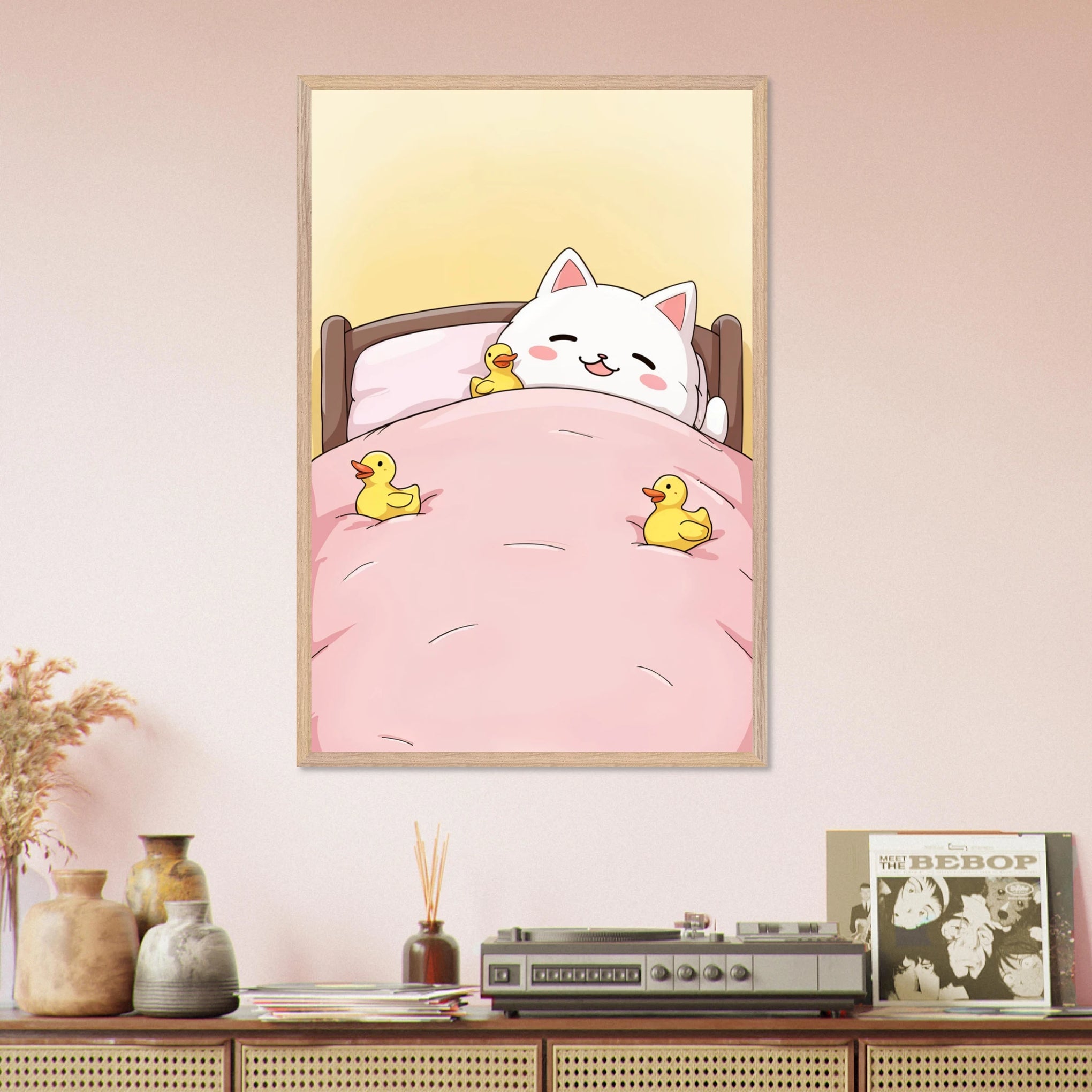 This design is for the person who delights in cute moments, comfort, and playfulness. With a blushing cat peacefully nestled under a pink blanket and surrounded by cheerful yellow ducks it instantly brings a smile. A perfect way to gift a memory of innocence, calm, and cuddles—Giftomory’s essence in every line.