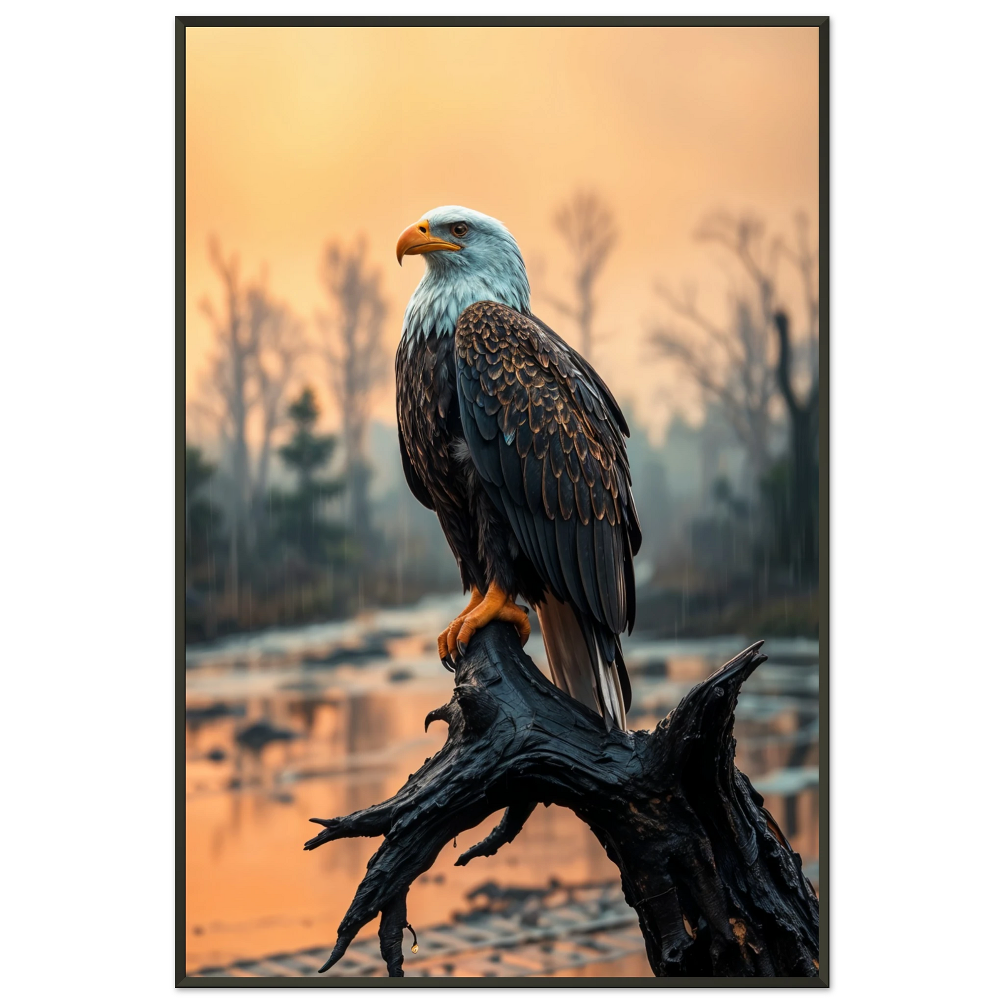 The "Eagle's Dawn" framed print is a powerful and evocative piece, designed to capture the emotional resonance of nature's strength and serenity. The majestic bald eagle, perched on a weathered branch, embodies the spirit of freedom and resilience. This design captures the emotional appeal of finding peace and inspiration in the wilderness, making it an ideal piece to enhance your sanctuary or workspace. The soft, misty background and the reflective water create an atmospheric depth, inviting viewers to connect with the quiet power of the natural world. Whether placed in a living room, study, or office, this artwork is a daily reminder of the strength and serenity within you. "Gift a Memory, Cherish Forever," and let this piece bring a touch of untamed beauty into your life.