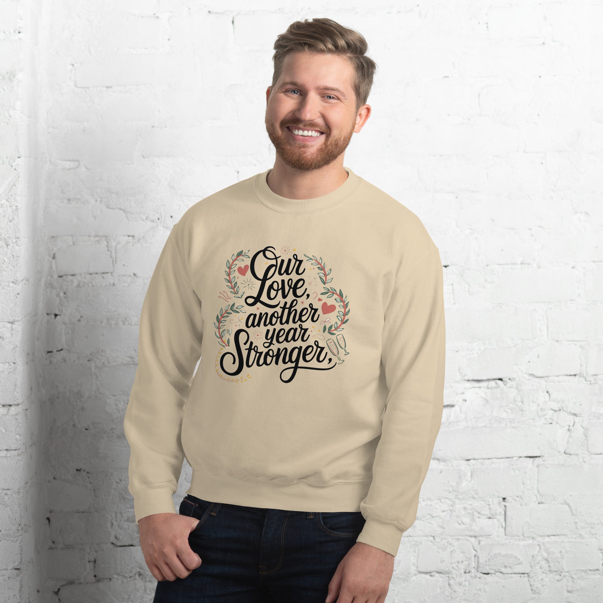 This "Our Love, Another Year Stronger" sweatshirt embodies the heartwarming sentiment of celebrating love and togetherness. With its romantic floral accents, playful hearts, and sparkling motifs, this design speaks volumes about shared memories and milestones. Its elegant yet lively composition radiates warmth, making it an ideal gift for your boyfriend this New Year. Perfect for adding charm to casual winter gatherings or creating a cozy ambiance at home, it’s a piece that merges the essence of "gift" and "memory," Giftomory’s unique hallmark.