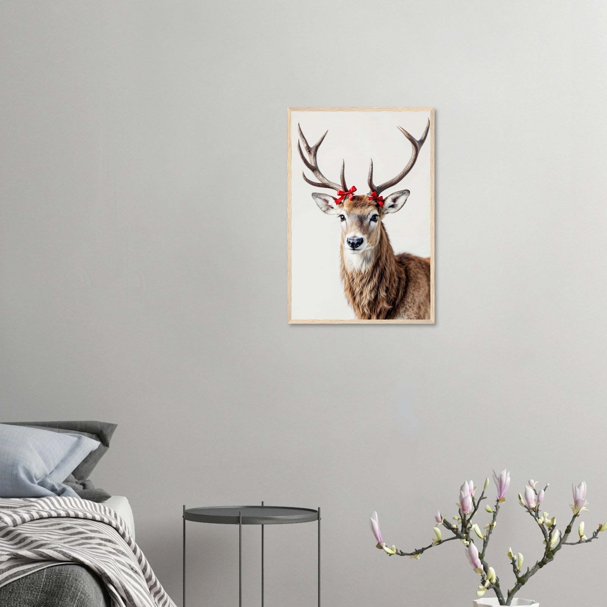 This "Festive Fawn" framed poster captures the serene beauty of nature with a playful twist, embodying the essence of Giftomory by merging "Gift" and "Memory." The close-up portrait of a deer, adorned with small red bows on its antlers, evokes feelings of gentle joy, festive cheer, and the simple beauty of the natural world. Imagine this piece adorning your living room, entryway, or even a cozy reading nook, creating an ambiance of warmth, tranquility, and whimsical charm. The deer's gentle expression, textured antlers, and contrasting red bows add depth and visual interest, making it a captivating focal point. The artistic elements, such as the soft colors, detailed textures, and the blend of natural and decorative elements, contribute to a serene yet delightful visual experience, making it a perfect gift to cherish and remember moments of joy and wonder.