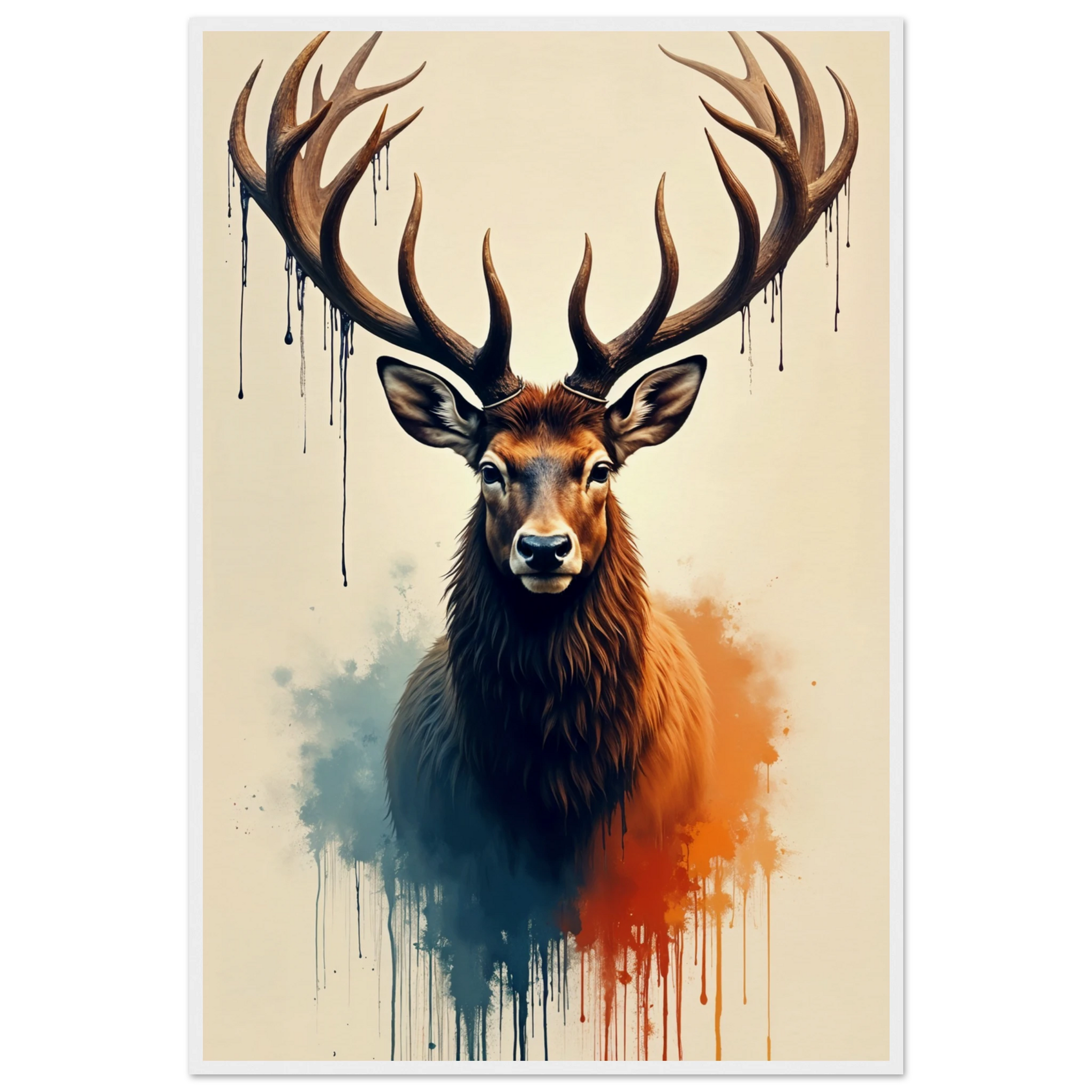 This gift is for the nature lover, the adventurer, or the one who finds peace in the wilderness. The Gift + Memory wooden framed poster features a commanding stage, painted with expressive detail and surrounded by watercolor splashes of twilight blue and ember orange. The ink-dripping antlers echo strength and motion, making it a breathtaking focal point for cabins, offices, or living rooms. Make it memorable. Gift it to yourself or someone else.