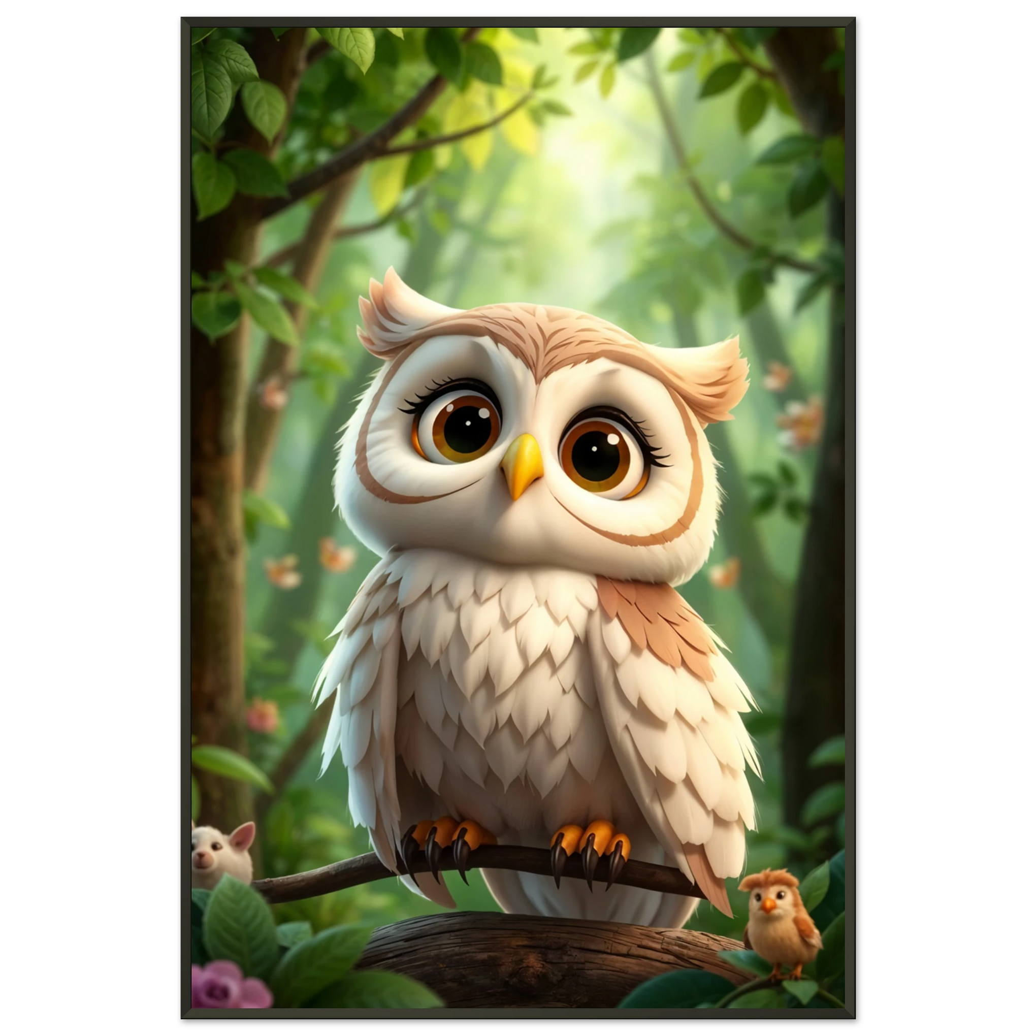 The "Forest Friend" framed print is a delightful and endearing piece, designed to evoke the emotional resonance of joy and innocence. The adorable owl, with its big, expressive eyes and fluffy appearance, radiates a sense of warmth and comfort. This design captures the emotional appeal of finding sweetness and wonder in the everyday, making it an ideal piece to enhance a child’s room, nursery, or any space where you seek a touch of playfulness. The lush, vibrant forest backdrop, filled with charming details, invites viewers to connect with the simple joys of nature. Whether placed in a child’s room or a cozy living area, this artwork serves as a daily reminder of the joy and innocence within you. "Gift a Memory, Cherish Forever," and let this piece bring a touch of playful charm into your life.