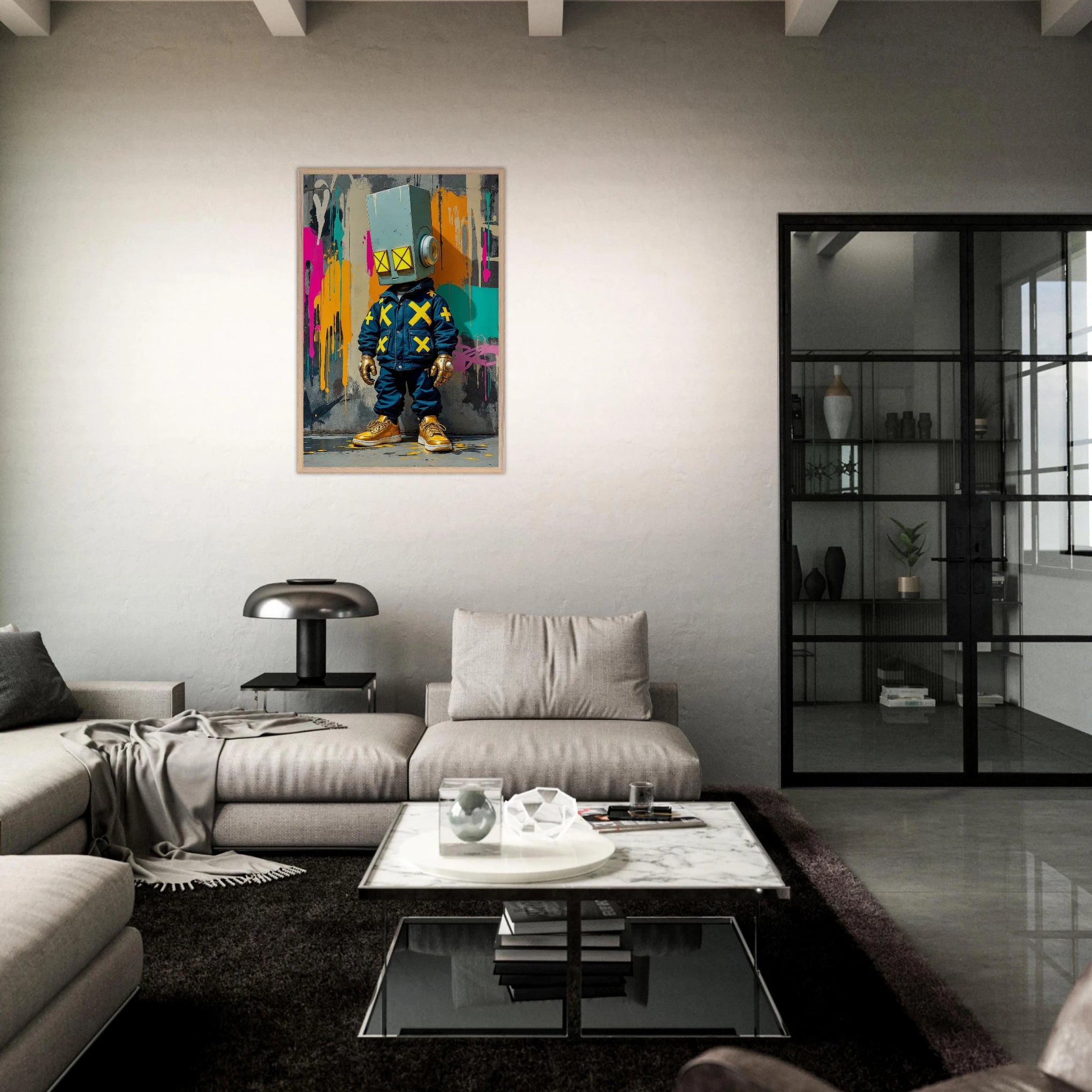 The StreetBot Pop Art Wooden Framed Poster delivers a striking blend of street culture and futuristic flair. A metallic-headed robot in streetwear stands against dripping neon graffiti, evoking rebellion and creativity. This gift is for pop art lovers, graffiti enthusiasts, and anyone who appreciates bold, fearless design. Gift + Memory = Giftomory.