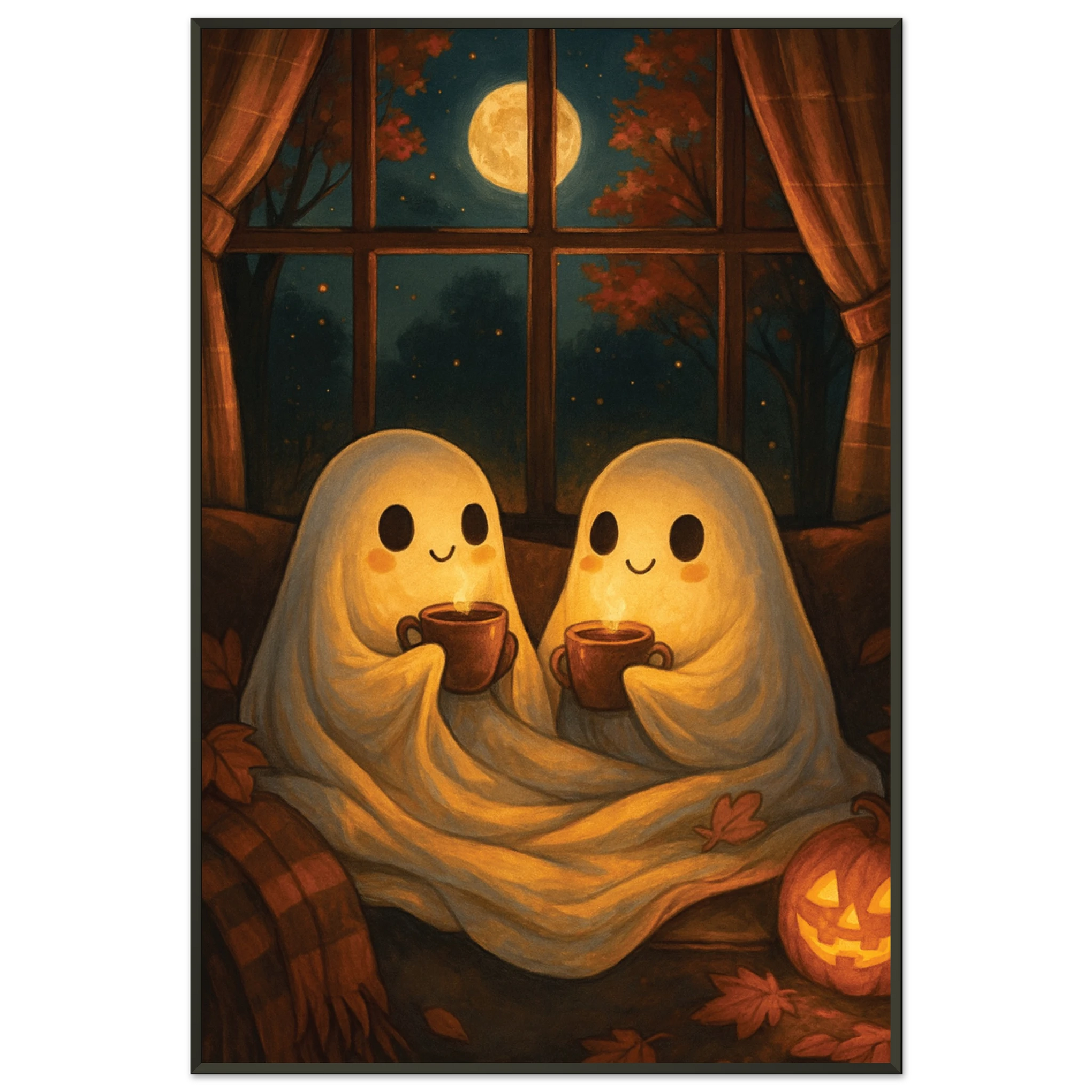 The Metal Framed Poster from Giftomory captures a tender October night—two smiling ghosts, steaming mugs, and a full moon beyond plaid curtains and crimson leaves. This gift is for anyone who treasures cozy rituals and gentle Halloween charm. Honeyed ambers and moonlit blues create a welcoming glow, turning corners into story-filled nooks—true to our Gift + Memory ethos.