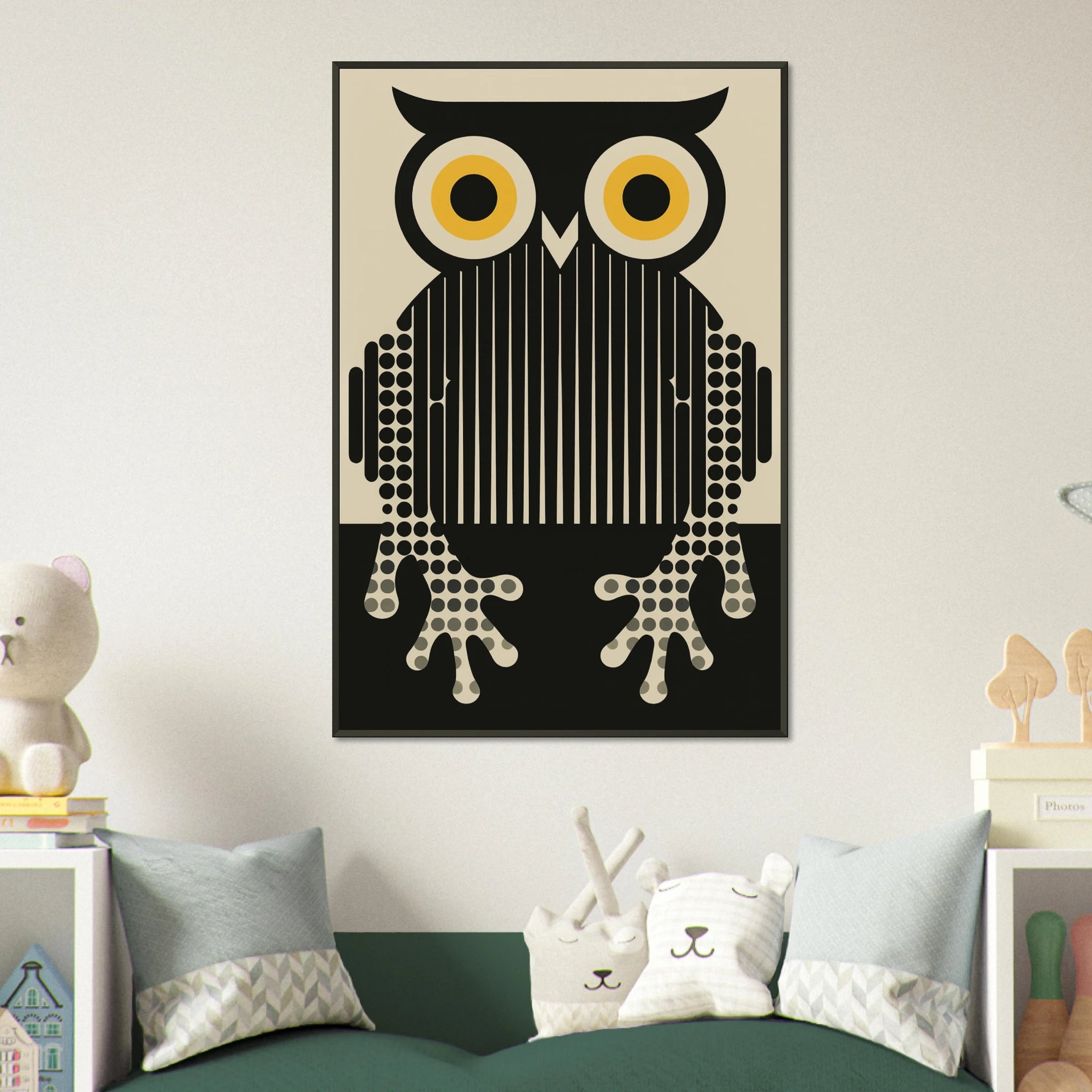 Command attention with the Modern Wisdom Owl metal framed poster—an abstract, symmetrical owl rendered in bold black and yellow against a soft beige backdrop. This gift is for thinkers, educators, or design lovers who appreciate graphic simplicity and symbolic meaning. It’s a stunning reminder that art can be both powerful and personal—capturing the Giftomory essence: a gift that becomes a memory.
