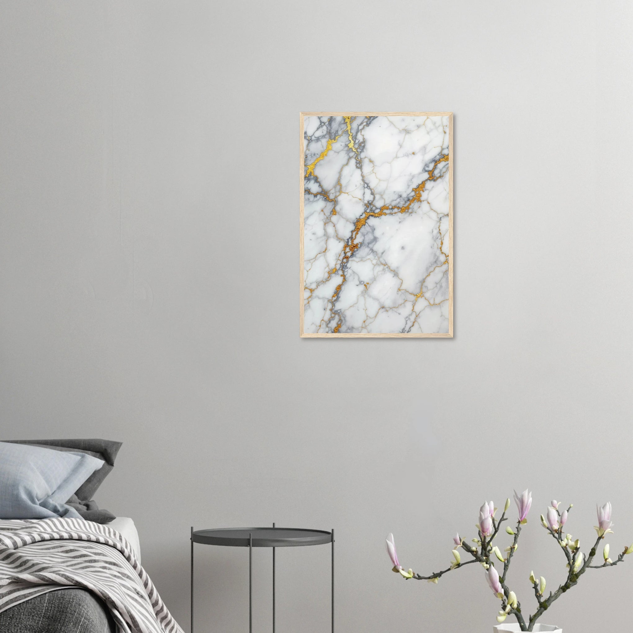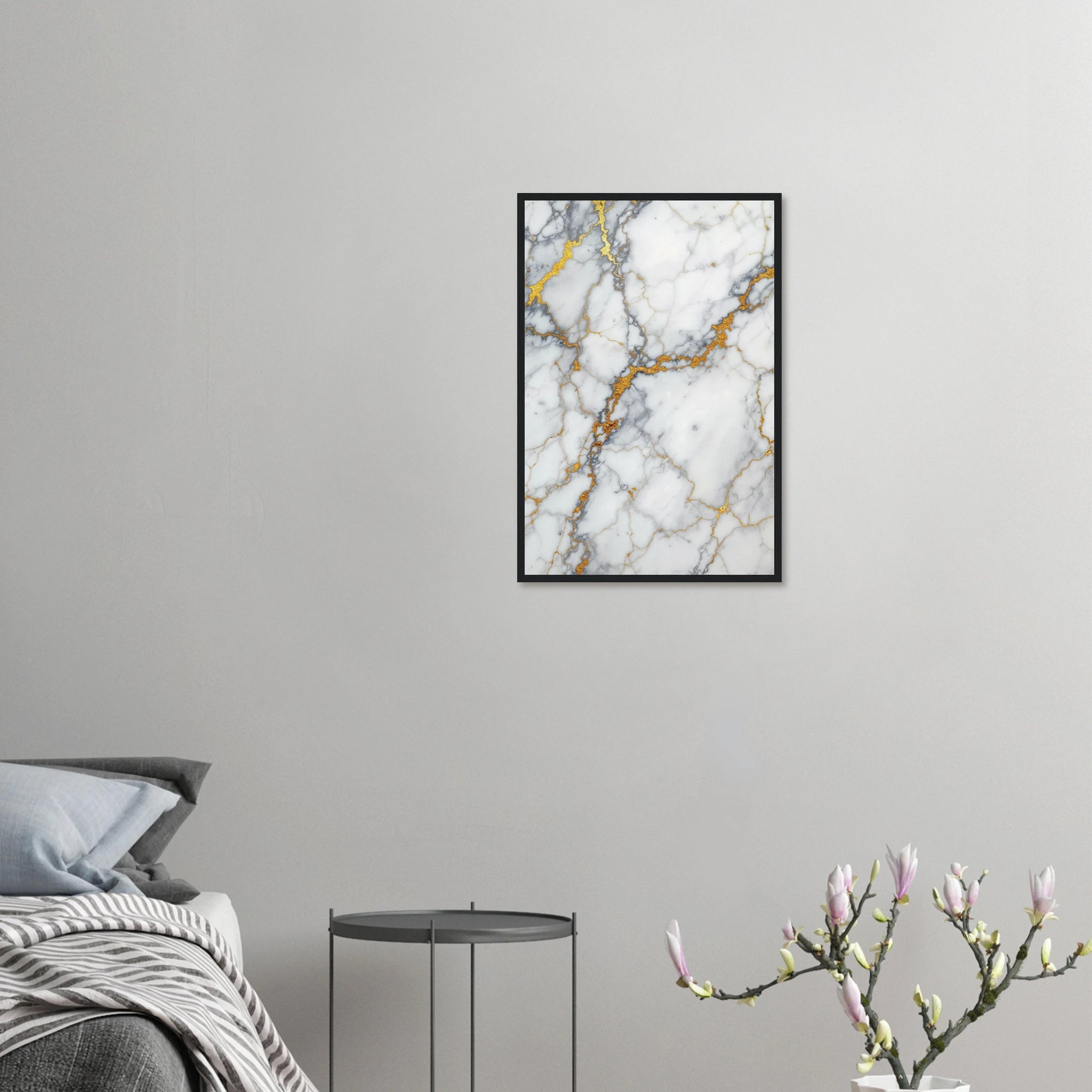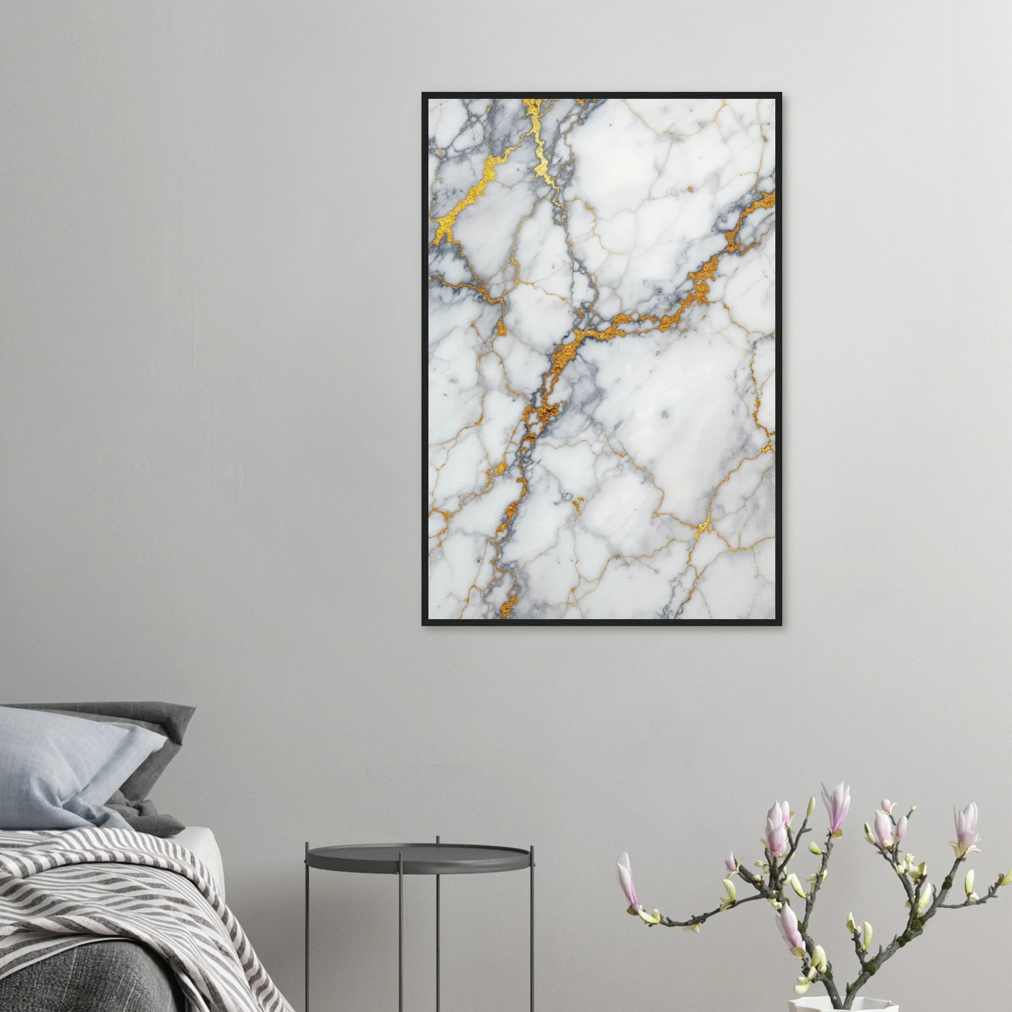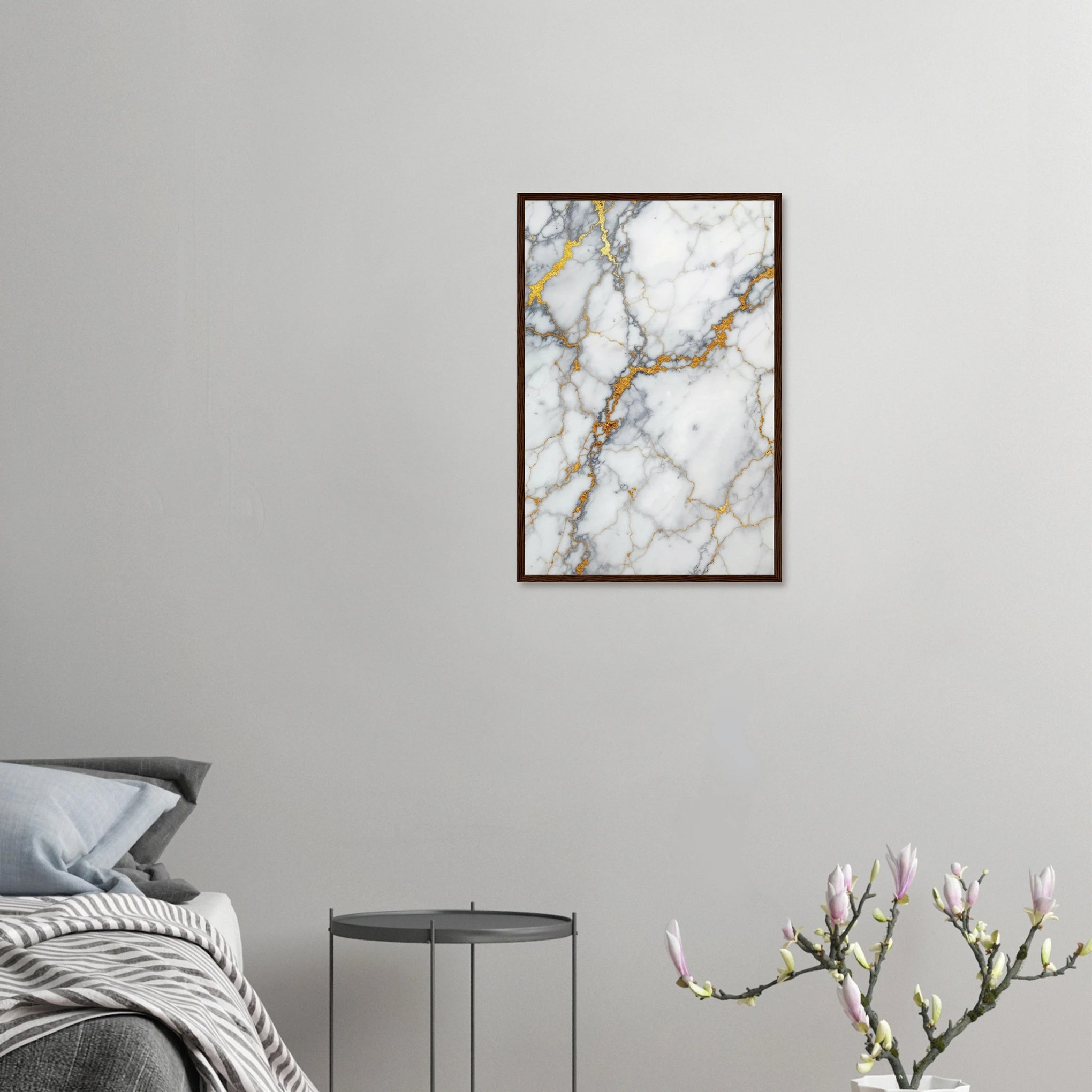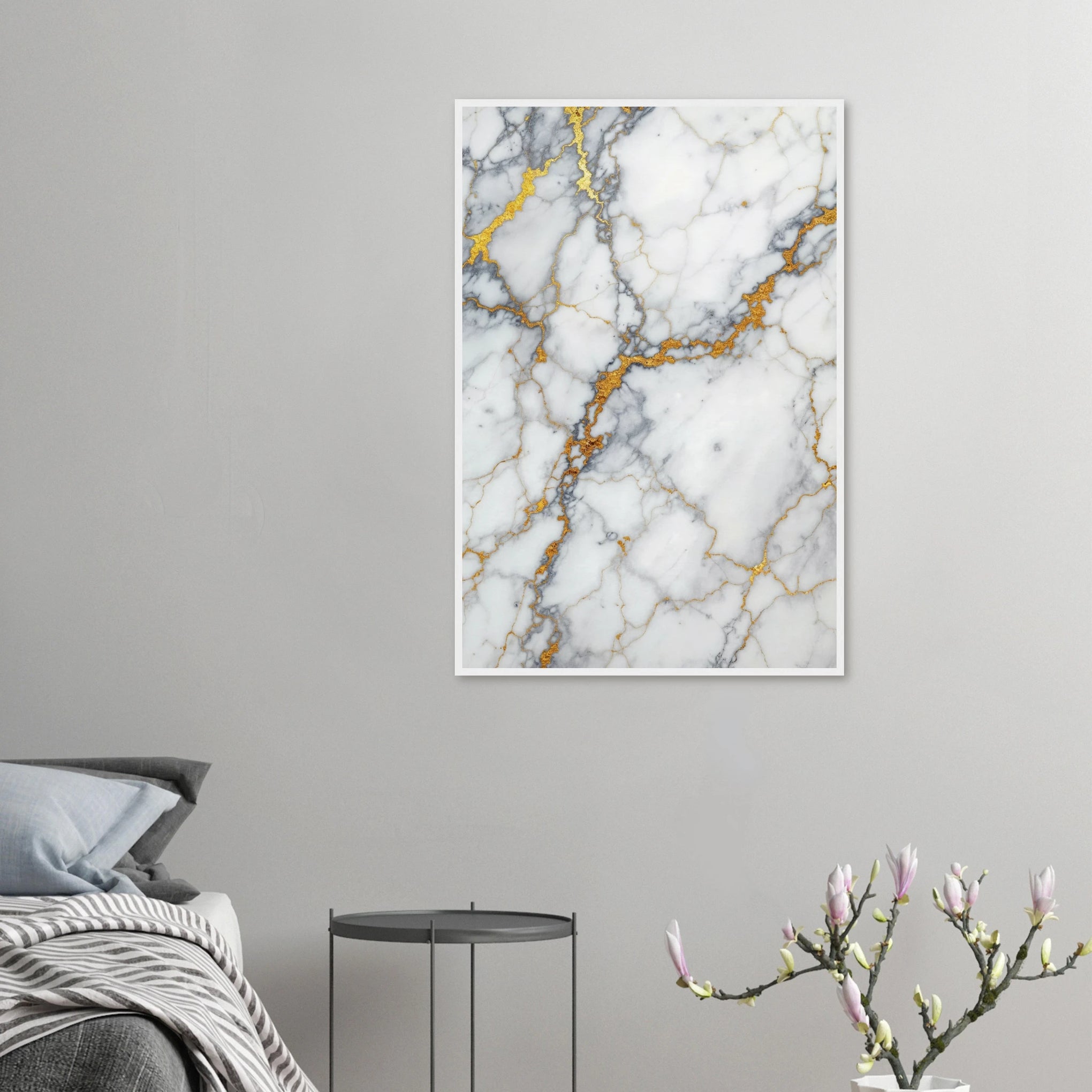 This "Gilded Marble" framed poster captures the timeless elegance and luxurious beauty of marble with gold veins, embodying the essence of Giftomory by merging "Gift" and "Memory." The intricate gold veins against the smooth, white marble evoke feelings of sophistication, refinement, and the enduring appeal of classic design. Imagine this piece adorning a living room, bedroom, or office, creating an ambiance of opulent beauty and artistic inspiration. The subtle gray veining and the polished finish add to the textural richness, making it a captivating focal point. The artistic elements, such as the contrasting colors, the intricate vein patterns, and the luxurious texture, contribute to a memorable and impactful visual experience, making it a perfect gift to cherish and remember moments of elegance and artistic appreciation.