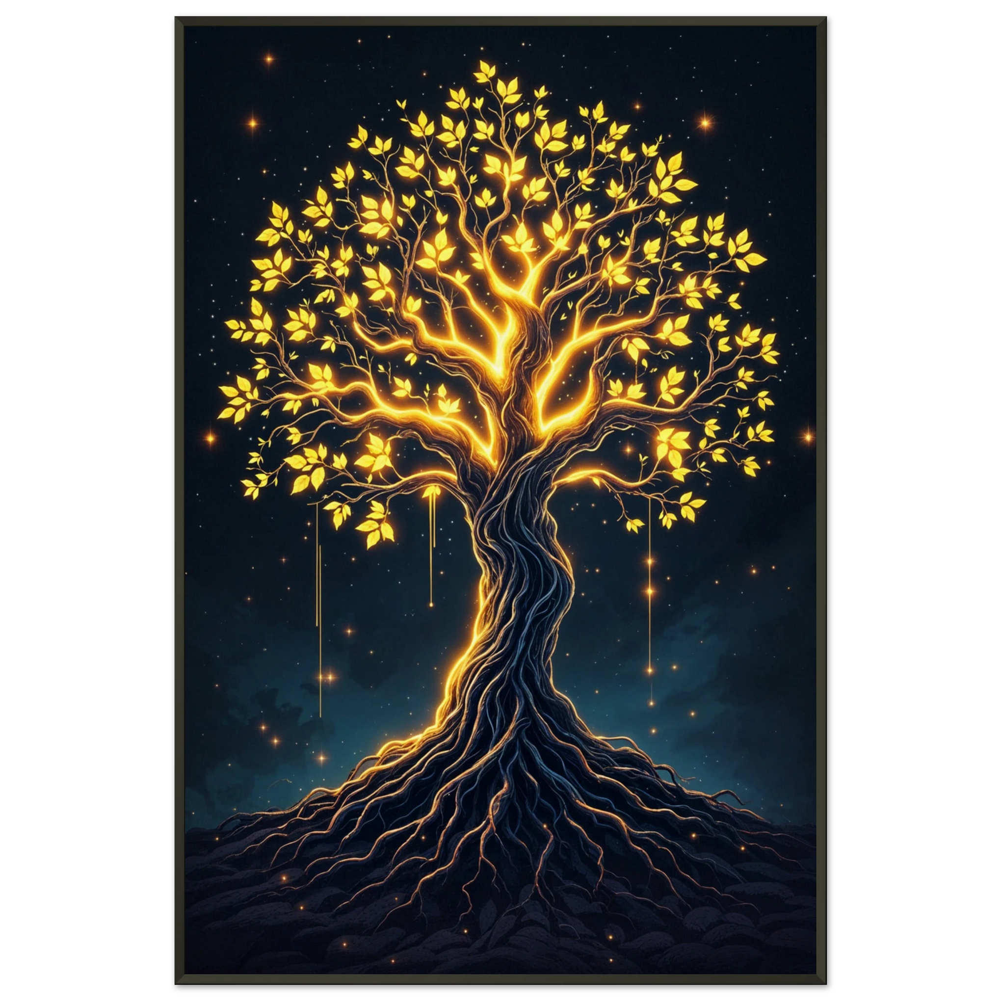 This "Golden Lumina" framed poster captures the enchanting beauty and mystical wonder of a glowing tree against a starry night, embodying the essence of Giftomory by merging "Gift" and "Memory." The golden leaves, the root-like branches, and the twinkling stars evoke feelings of magic, tranquility, and the timeless beauty of nature's mysteries. Imagine this piece adorning a living room, bedroom, or meditation space, creating an ambiance of artistic inspiration and serene wonder. The glowing threads and the detailed textures make it a captivating focal point. The artistic elements, such as the digital illustration style, the warm color palette, and the surreal composition, contribute to a memorable and impactful visual experience, making it a perfect gift to cherish and remember moments of wonder and artistic appreciation.