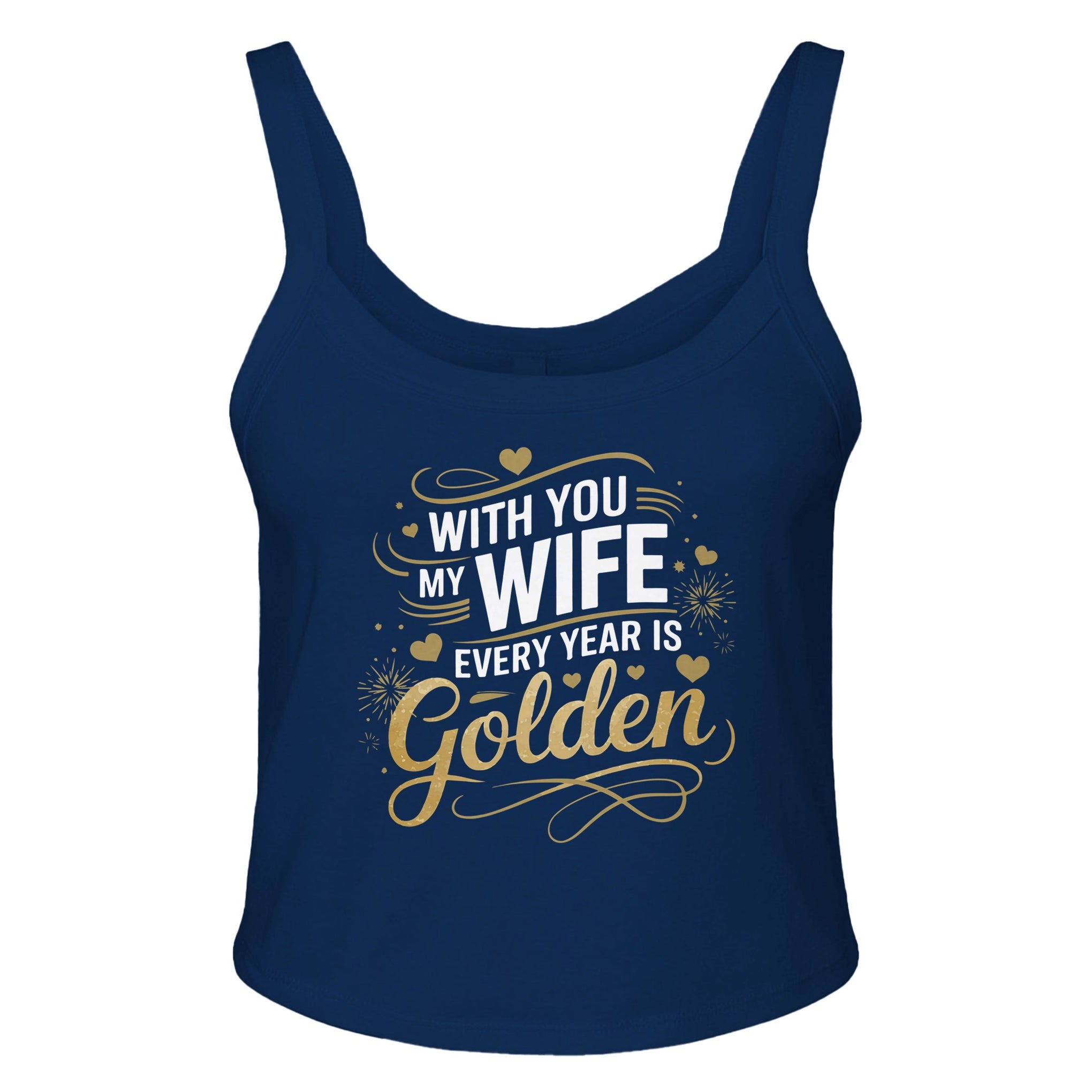 This design is a heartfelt tribute to the golden years of your marriage with your wife. The elegant typography, "With You, My Wife, Every Year is Golden," is a beautiful declaration of your enduring love and appreciation. The shimmering gold accents and delicate script create a luxurious and romantic atmosphere, symbolizing the preciousness of your time together. This design is more than just a piece of clothing; it's a symbol of your unwavering love and a reminder of the beautiful memories you've created together.