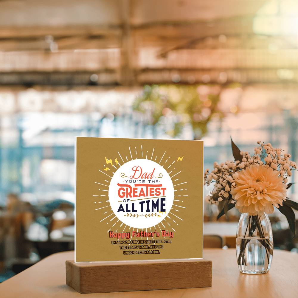 Celebrate your G.O.A.T. with the Gift + Memory Acrylic Square Plaque — a powerful tribute to the man whose quiet strength and steady hand shaped your life. With bold lettering, lightning accents, and sunburst detailing, this gift is for the father who’s always been your greatest support and hero, especially on Father’s Day.