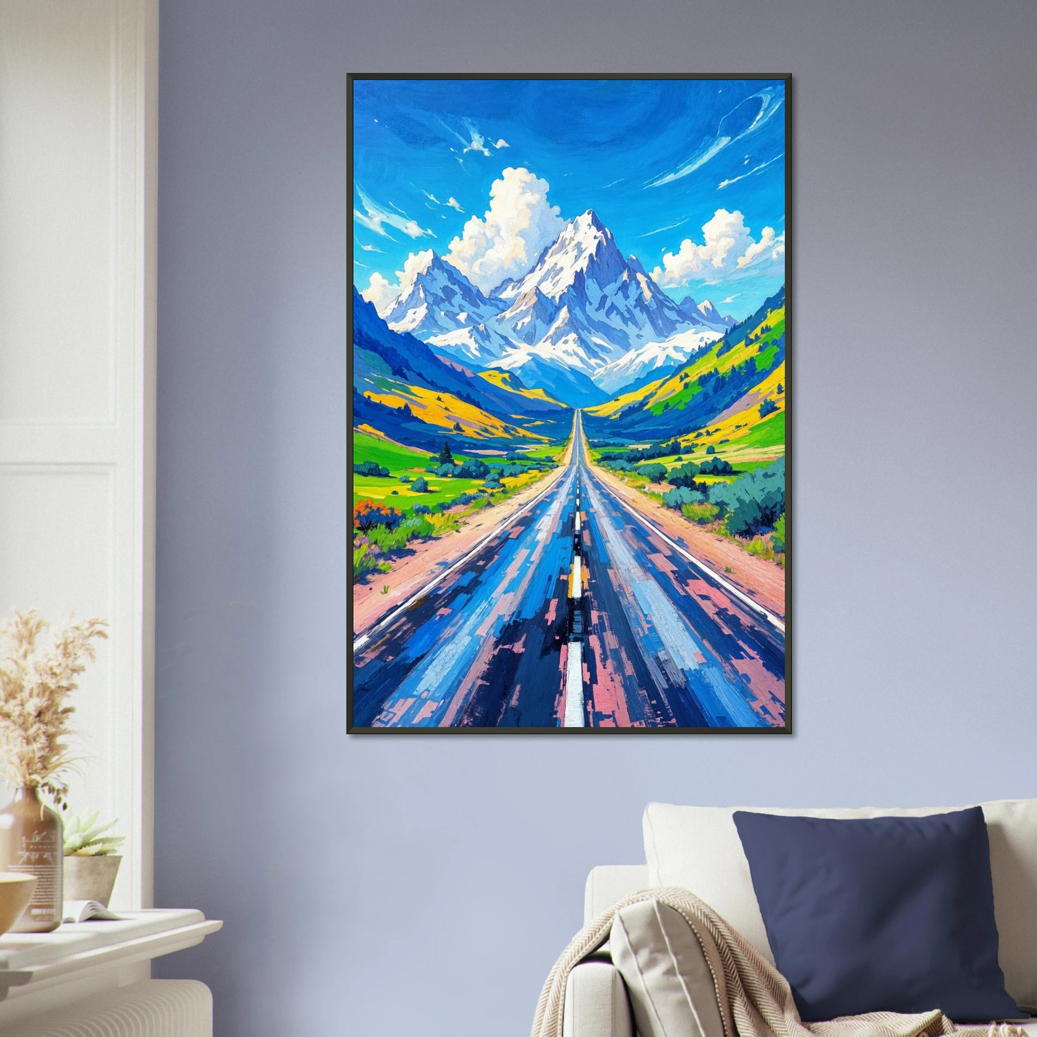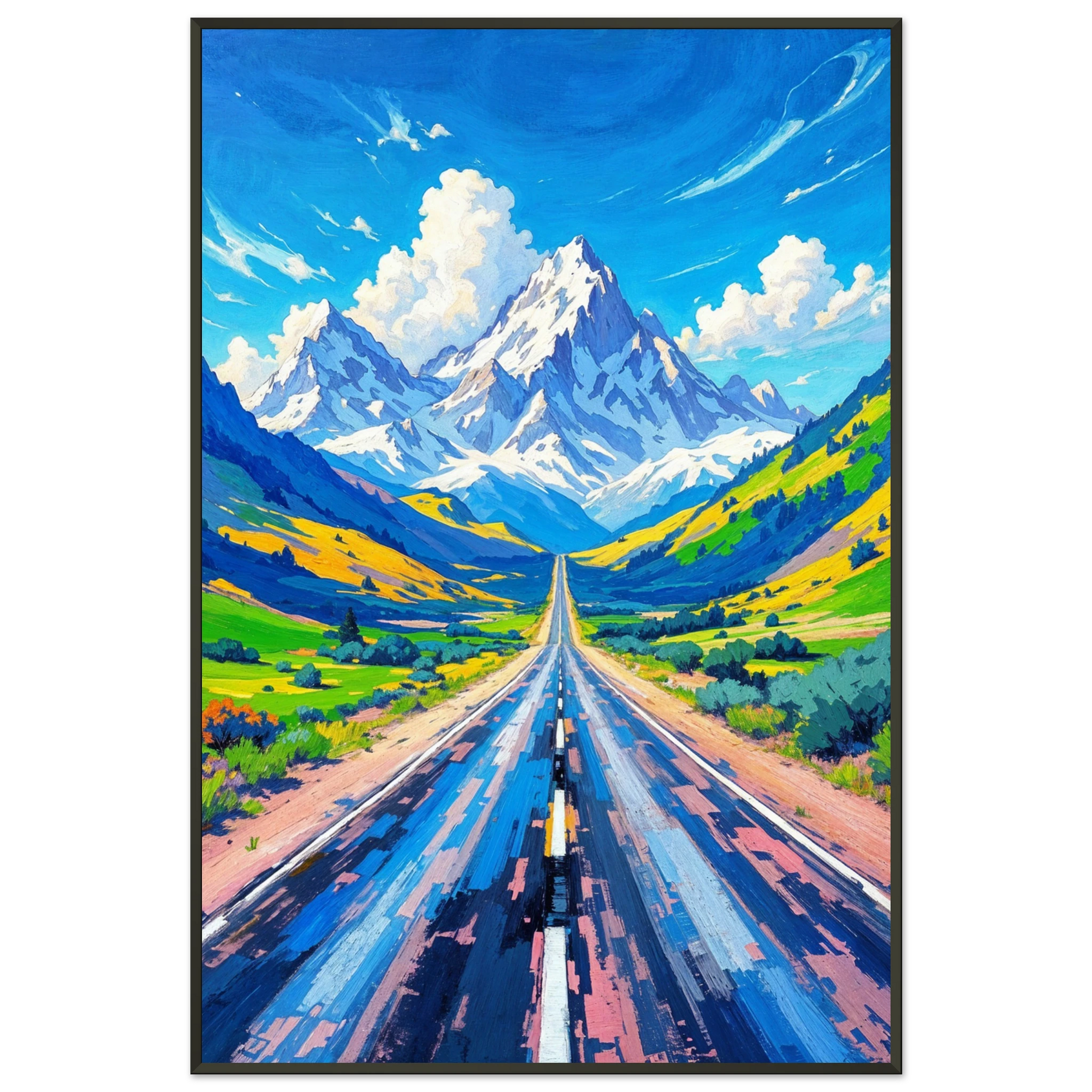 Bold, uplifting, and impossibly vibrant, this Metal Framed Poster captures the thrill of open roads and the promise of distant peaks. Brushstrokes create dynamic motion along a central highway that vanishes into snow-covered mountains under a luminous blue sky. Lush green valleys and golden hills unfold on either side, inviting the eye to travel and the heart to dream. Every color sings—cerulean blues, sunny yellows, soft lavenders—uniting in a visual symphony of nature and adventure.