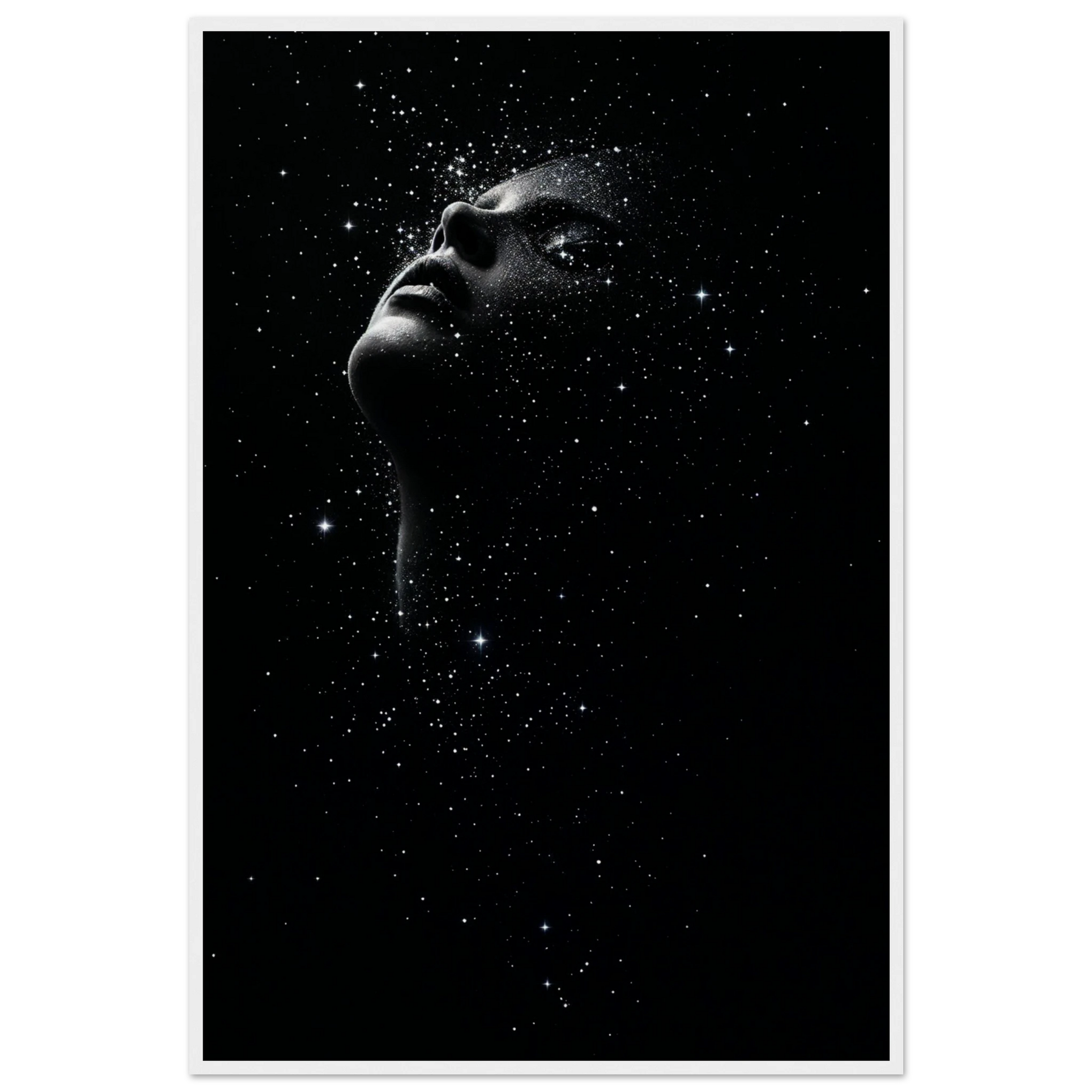 This "Cosmic Contemplation" framed poster captures the profound connection between humanity and the universe, embodying the spirit of Giftomory by merging "Gift" and "Memory." The portrait of a person gazing upwards, adorned with stars, evokes feelings of wonder, introspection, and the vastness of the cosmos. Imagine this piece adorning a living room, bedroom, or meditation space, creating an ambiance of contemplation and celestial beauty. The dark, textured background and the scattering of stars make it a captivating focal point. The artistic elements, such as the dramatic lighting, the detailed rendering of the stars, and the contemplative composition, contribute to a memorable and thought-provoking visual experience, making it a perfect gift to cherish and remember moments of introspection and cosmic connection.