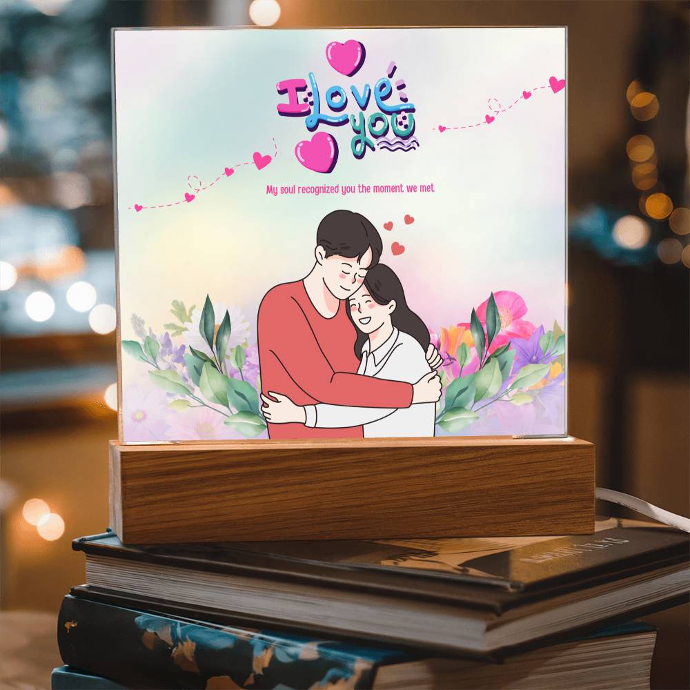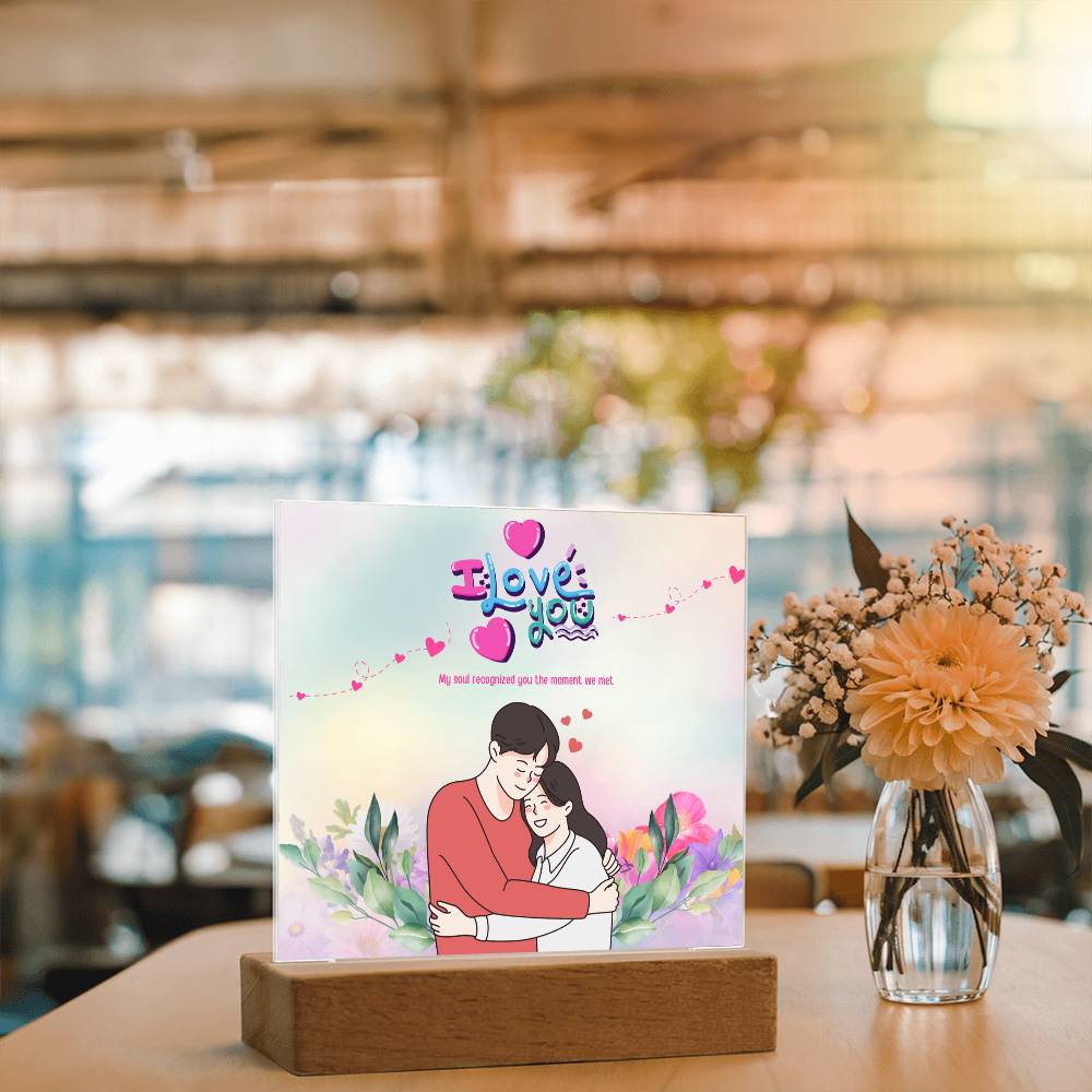 The Acrylic Plaque showcases a tender couple’s embrace framed with soft florals and the heartfelt phrase, “My soul recognized you the moment we met.” This gift is for partners who value love at first sight and cherish meaningful connections. At Giftomory, every design combines Gift + Memory to enrich your home with love, light, and sentiment.