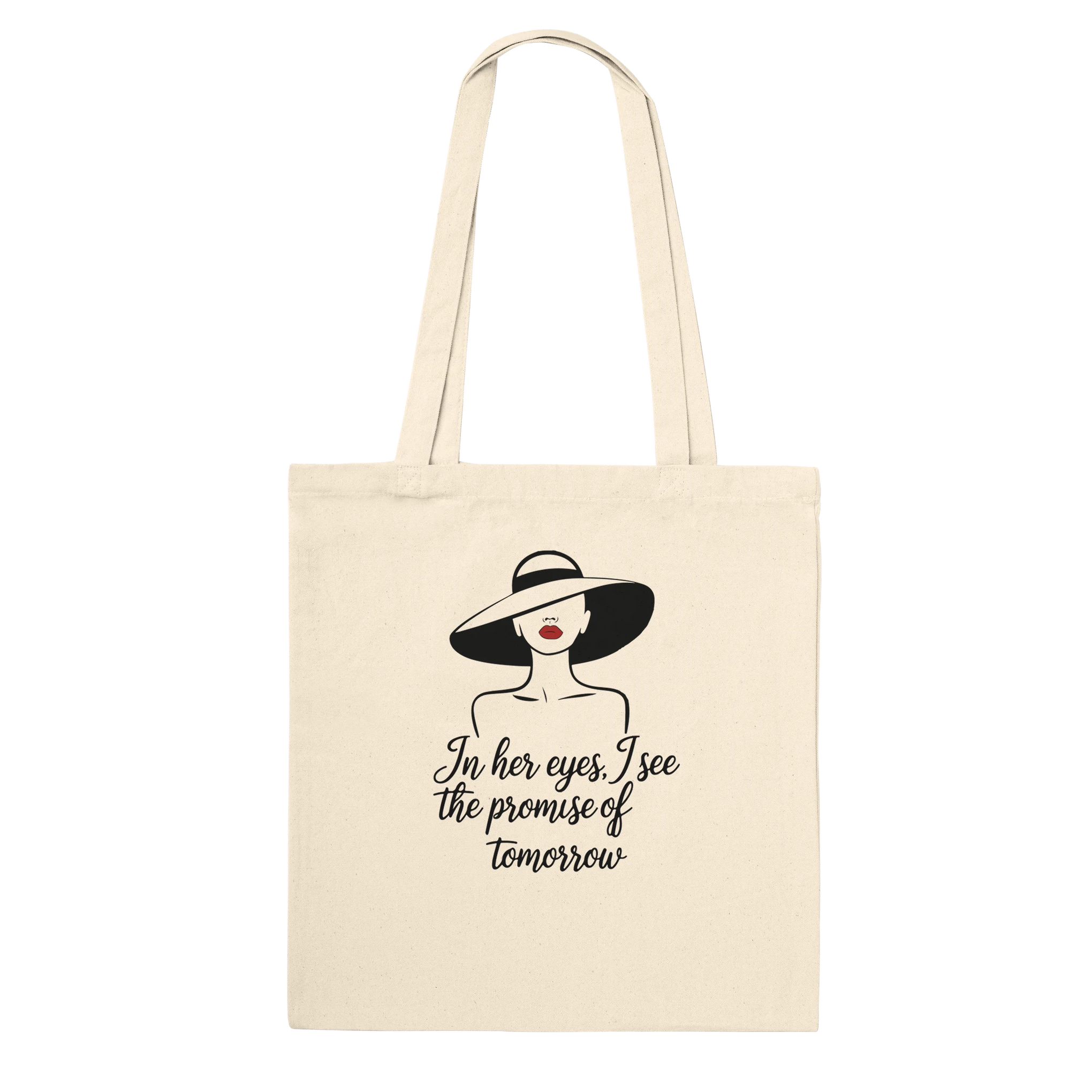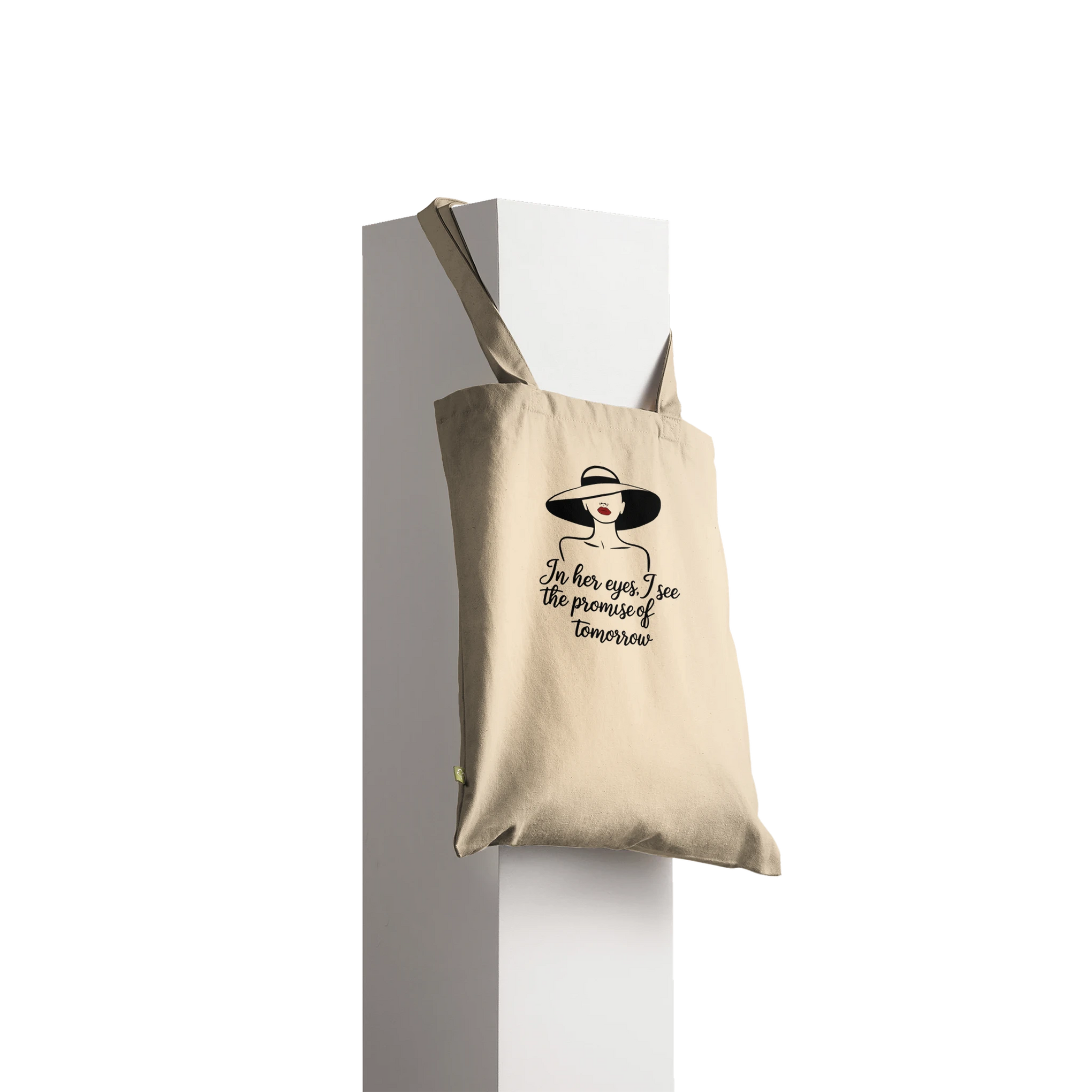 This graceful tote features a woman in a wide-brimmed hat, her red lips striking against a soft cream backdrop, paired with the romantic phrase: "In her eyes, I see the promise of tomorrow." It’s a celebration of femininity, poise, and hope. This design is for the person who sees beauty in strength and carries herself with timeless grace. Perfectly aligned with Giftomory’s vision, where fashion becomes memory and gifting becomes emotional connection.