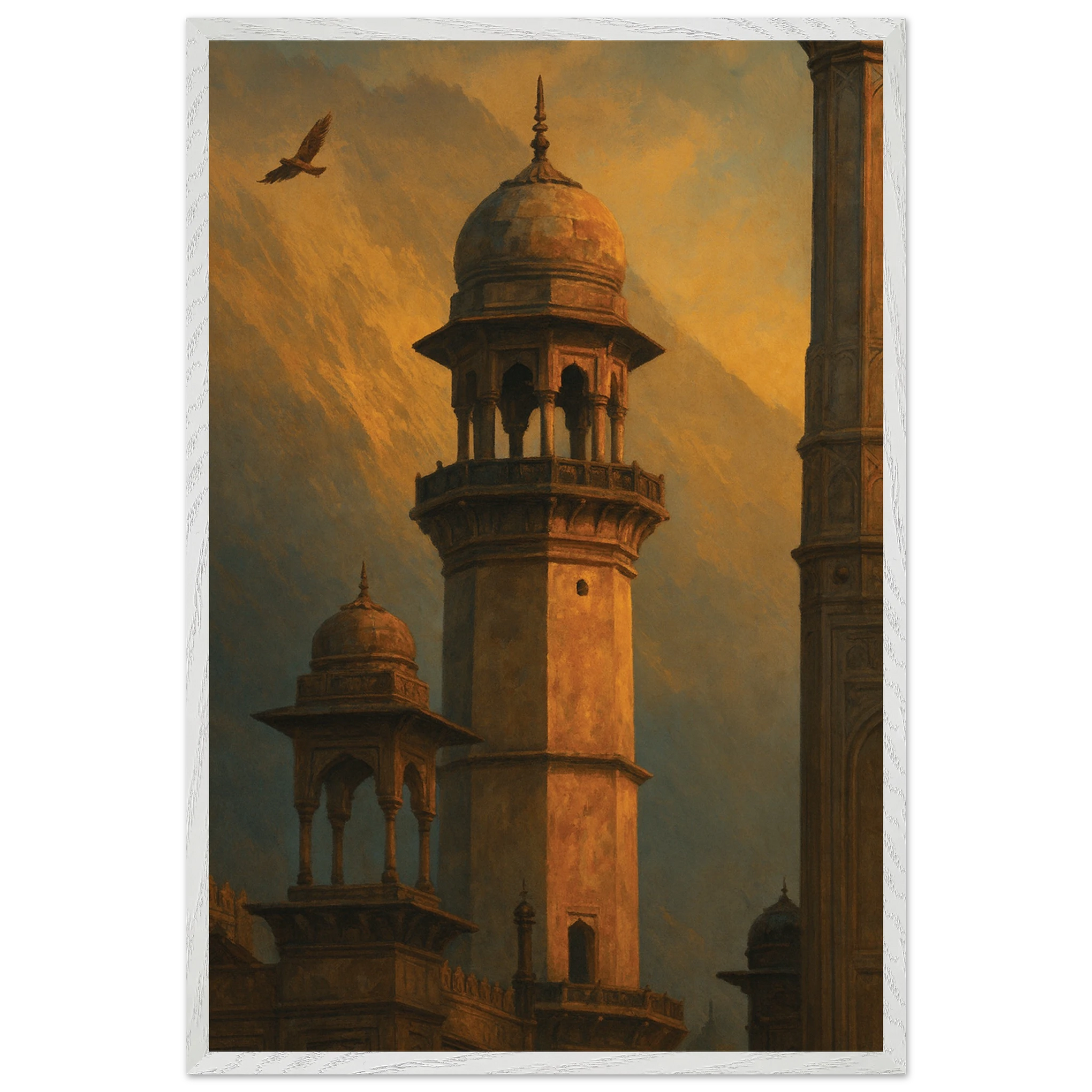 Celebrate architectural majesty with this Wooden Framed Poster showcasing an illuminated minaret against a golden-hour sky. Rich amber, terracotta, and olive tones create an atmosphere of spiritual tranquility and timeless beauty, while a soaring bird symbolizes freedom and divine connection. This gift is for heritage enthusiasts, travelers, and souls who cherish cultural memories and sacred spaces. At Giftomory, we believe every piece merges Gift + Memory, transforming walls into portals of meaningful remembrance and artistic reverence.