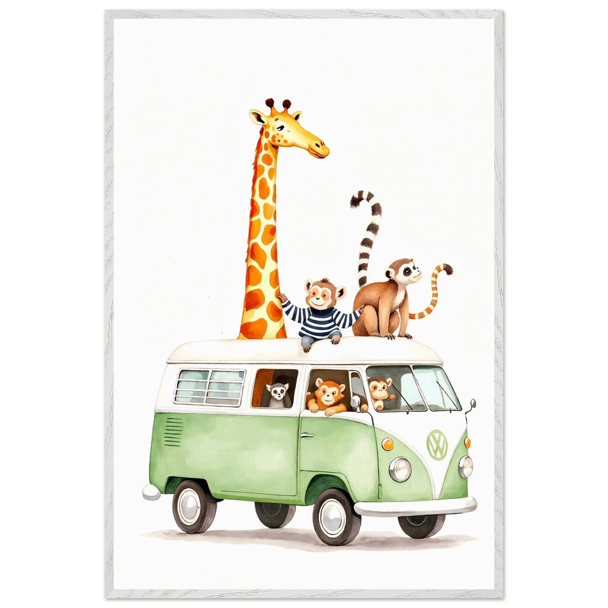This gift is for the little adventurer — a child with big dreams, a love for animals, and a heart full of laughter. The Safari Van Wooden Framed Poster features a whimsical green van filled with monkeys, lemurs, and a towering giraffe on a playful road trip. With soft watercolor textures and gentle pastels, it sparks imagination and wonder. A joyful Gift + Memory that adds fun and warmth to nurseries, playrooms, or reading nooks.