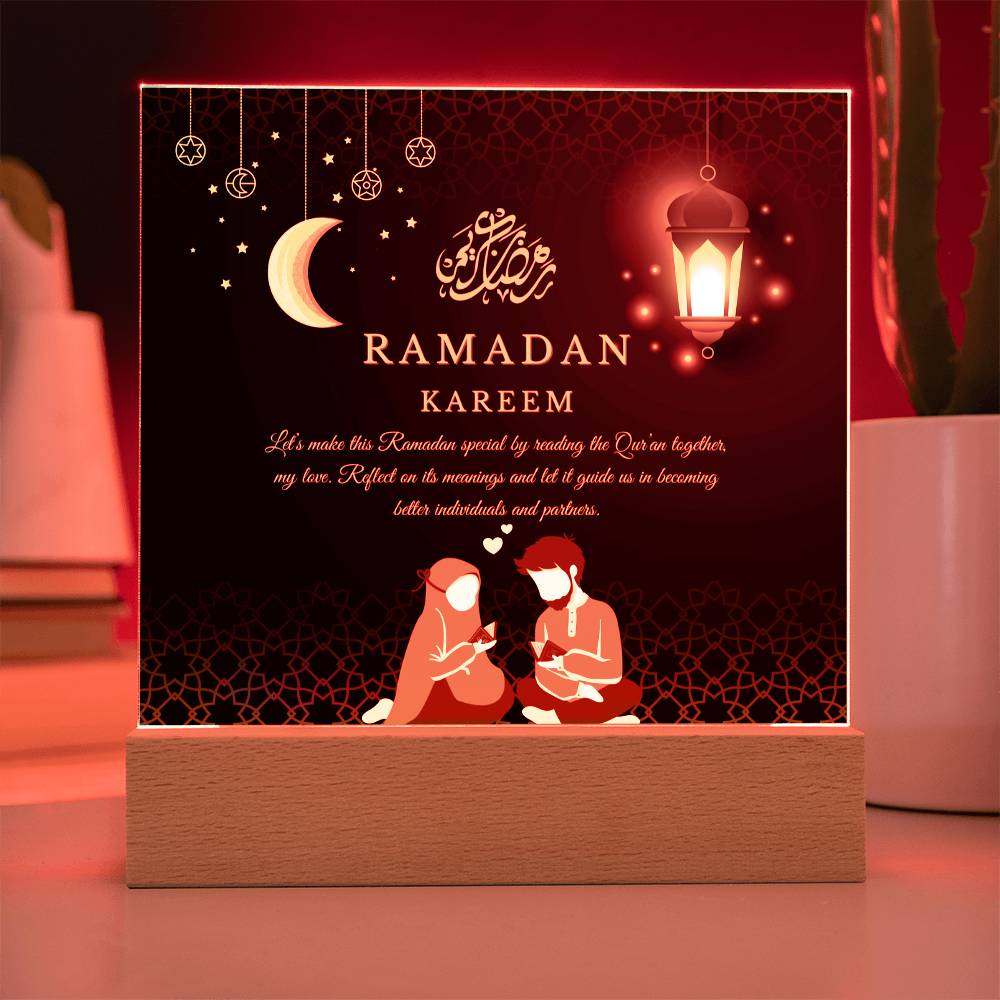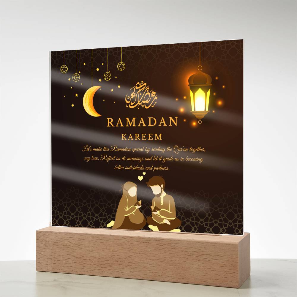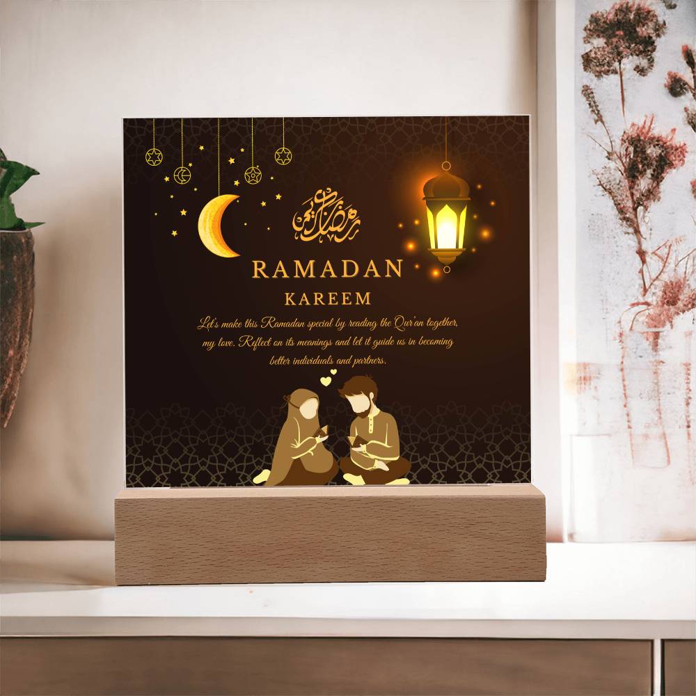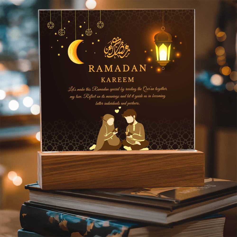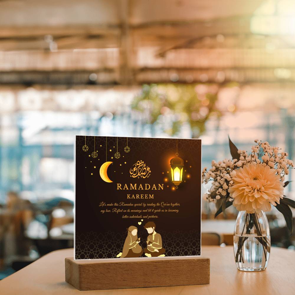This "Ramadan Kareem: Dear Husband" acrylic plaque is more than just a decorative piece; it's a heartfelt expression of love and spiritual devotion for a cherished husband, embodying the essence of Giftomory by merging "Gift" and "Memory." The light background with a subtle, ornate pattern evokes the serene and sacred atmosphere of Ramadan. The Arabic phrase "Ramadan Kareem" adds a traditional touch, while the loving message conveys deep affection and admiration. Imagine this plaque displayed in your living room, bedroom, or prayer area, creating an ambiance of warmth, love, and spiritual reflection. The emphasis on kindness and compassion makes it a perfect gift to cherish and remember the spiritual bond during this holy month. The artistic elements, such as the elegant calligraphy and thoughtful composition, contribute to a serene and meaningful visual experience.