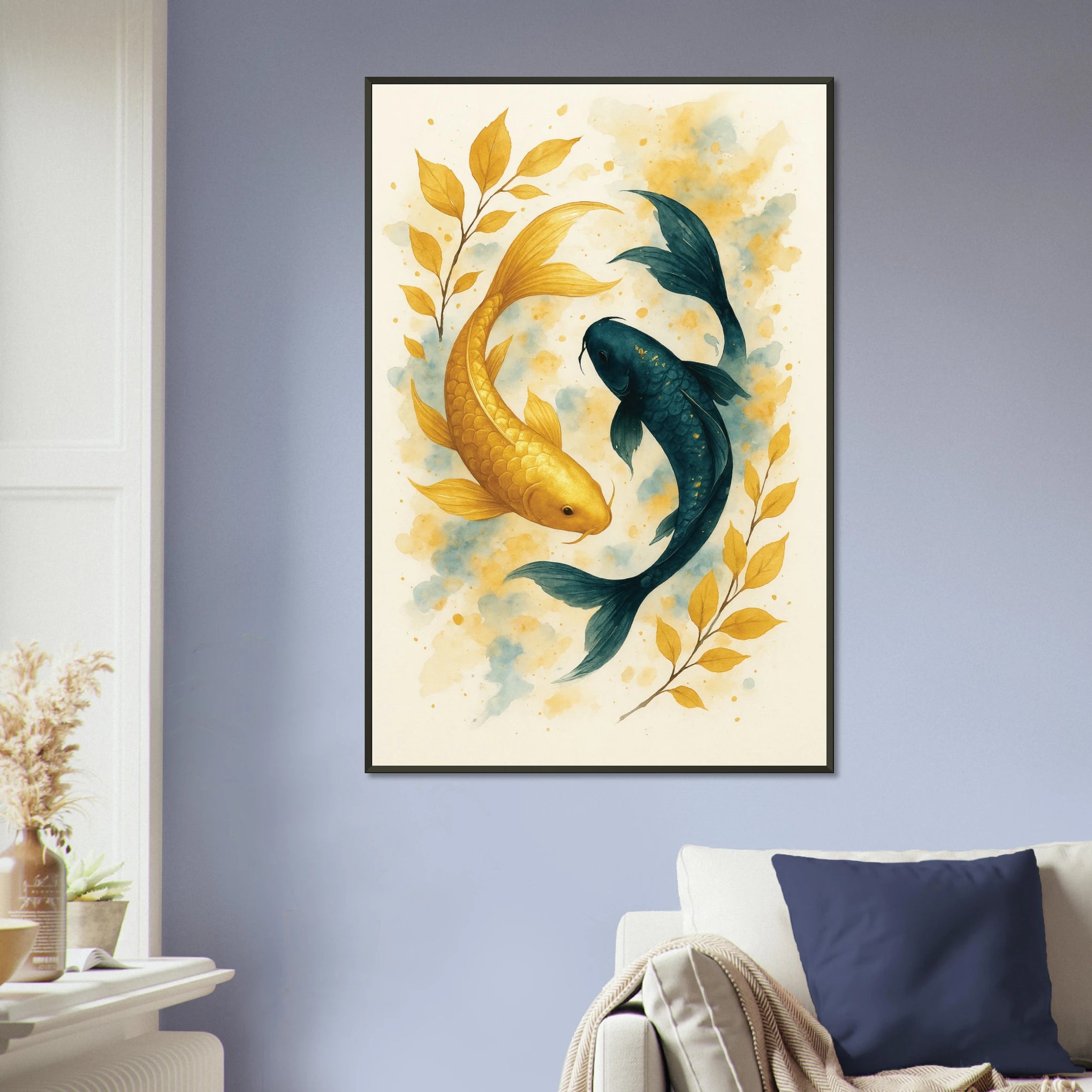The Metal Framed Poster from Giftomory portrays two koi circling in poetic balance—gold for prosperity, indigo for depth—framed by delicate leaves and soft washes. This gift is for anyone beginning anew, seeking harmony, or honoring a special bond. Place in living rooms, entries, or studios to invite serenity—true to our Gift + Memory ethos.