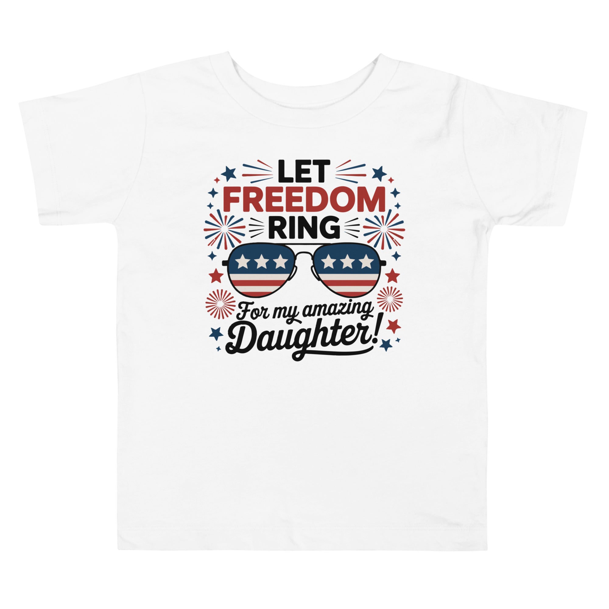 Designed for proud parents and even prouder daughters, this Bella+Canvas Toddler Short Sleeve Tee lights up with festive red, white, and blue fireworks and sunglasses filled with stars and stripes. This design is for daughters who shine bright in both patriotism and personality—a perfect way to wear love loud. A Gift + Memory masterpiece.