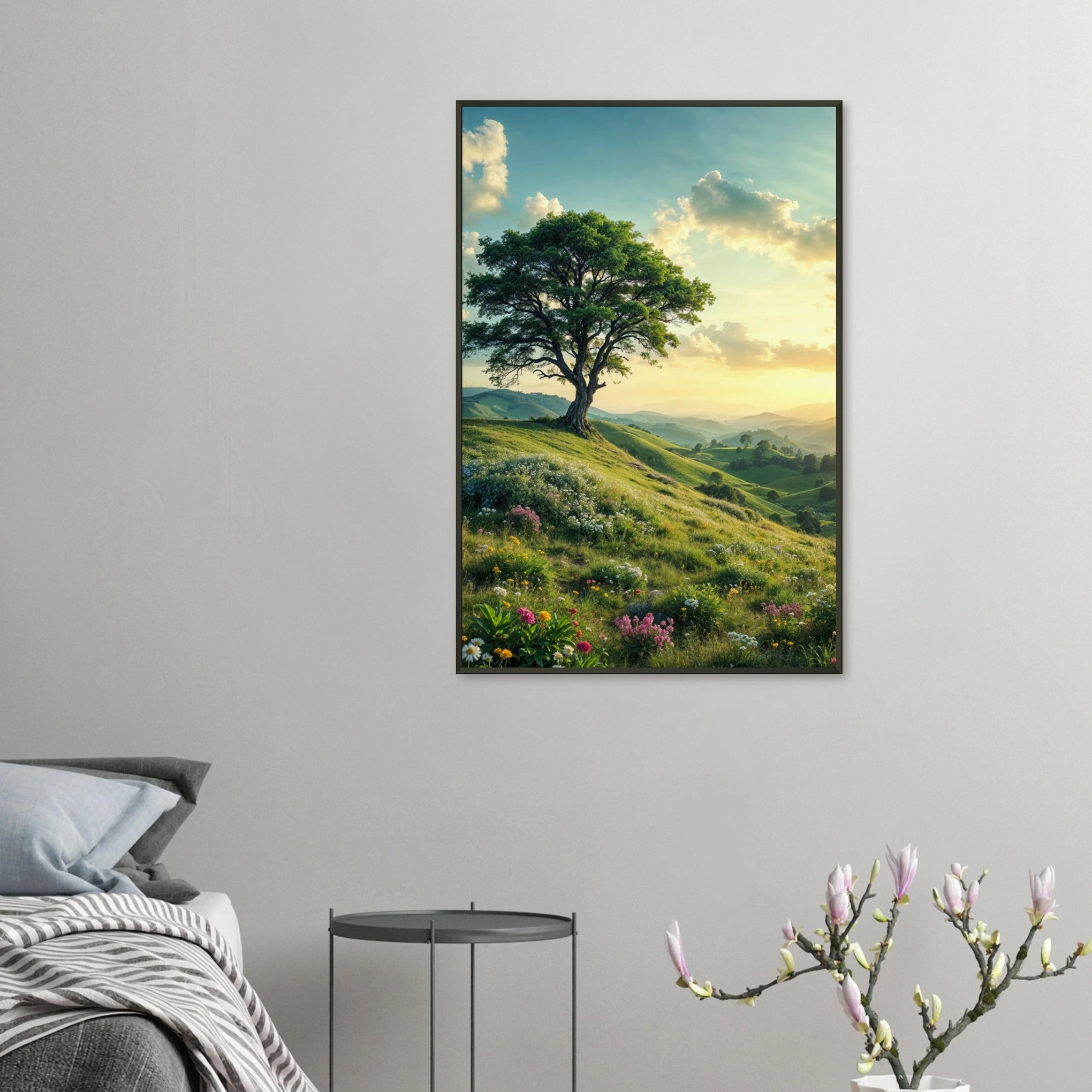 This "Lone Tree Vista" framed poster captures the serene beauty and tranquil harmony of a lone tree standing in a rolling meadow, embodying the essence of Giftomory by merging "Gift" and "Memory." The lush green hill, the vibrant wildflowers, and the warm sunset sky evoke feelings of peace, tranquility, and the timeless beauty of nature's landscapes. Imagine this piece adorning a living room, bedroom, or meditation space, creating an ambiance of calm sophistication and natural wonder. The soft, hazy horizon and the detailed rendering of the tree and meadow make it a captivating focal point. The artistic elements, such as the warm color palette, the detailed textures, and the serene composition, contribute to a memorable and impactful visual experience, making it a perfect gift to cherish and remember moments of peace and natural beauty.