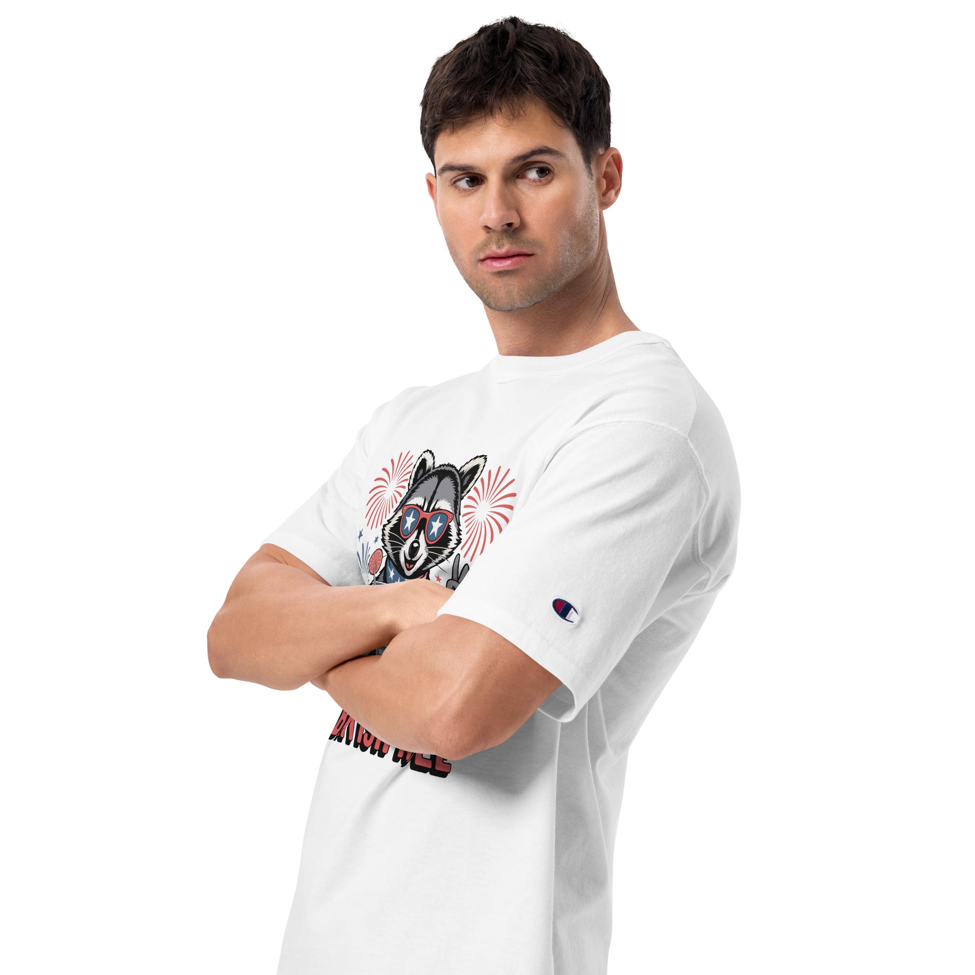 The "Too Cool for British Rule" design captures bold independence with a side of humor. A patriotic raccoon flashes a peace sign, cocktail in hand, surrounded by celebratory fireworks. This gift is for the fun-loving man who enjoys a witty style and American pride. The Men’s Champion T-Shirt by Giftomory transforms freedom into fashion, fusing nostalgia with attitude—the perfect Gift + Memory for July 4th celebrations. Crafted with quality and comfort in mind, this tee includes: