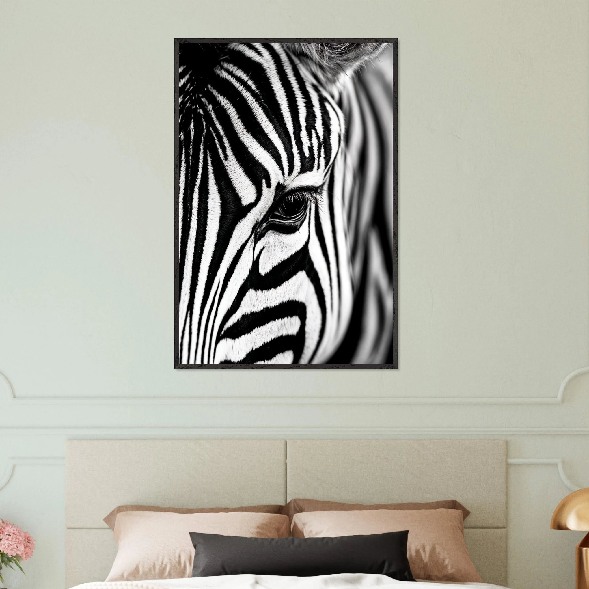 The Wooden Framed Poster features a beautifully intense zebra close-up in rich black and white, where each stripe tells a story of balance, individuality, and grace. This gift is for the person who sees beauty in contrast. The eye, detailed and expressive, evokes connection, aligning perfectly with our Gift + Memory promise.