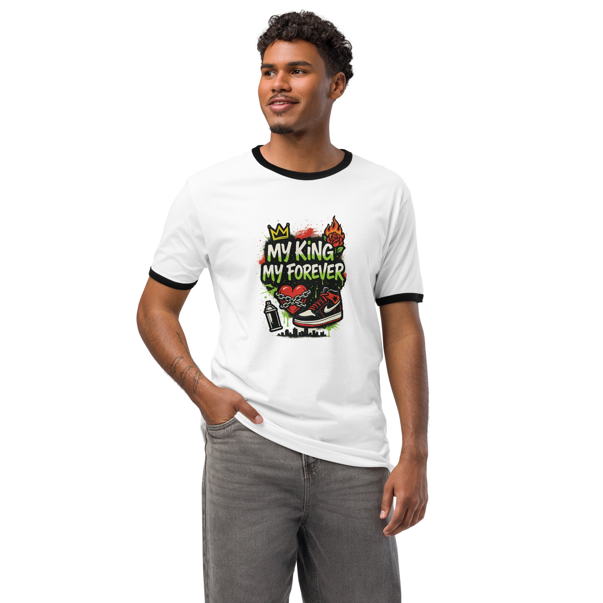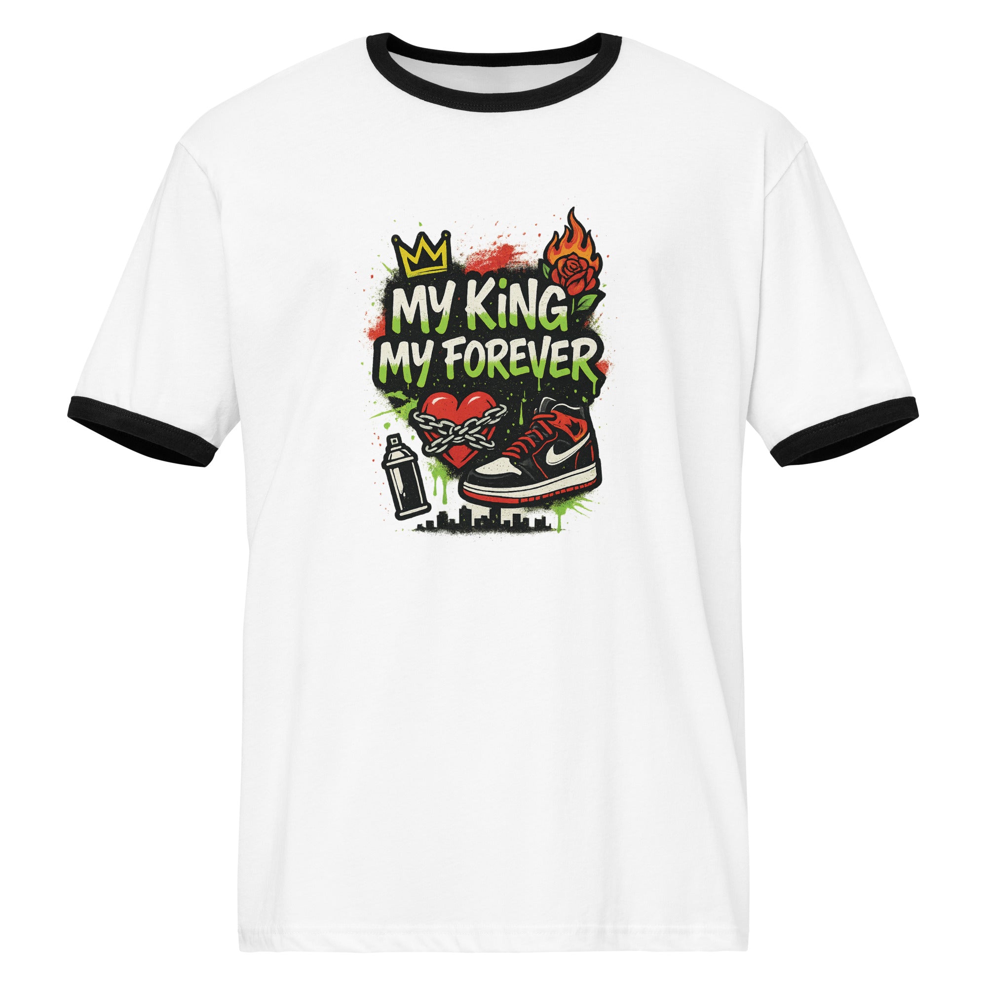 Express unbreakable devotion with the My King My Forever Unisex Ringer T-shirt from Giftomory. The graffiti-inspired design features a golden crown, fiery rose, chained heart, and sneaker art, representing passion, loyalty, and timeless love. This gift is for honoring your husband, partner, or king—turning emotions into a bold fashion statement that fuses Gift + Memory in a streetwear style.